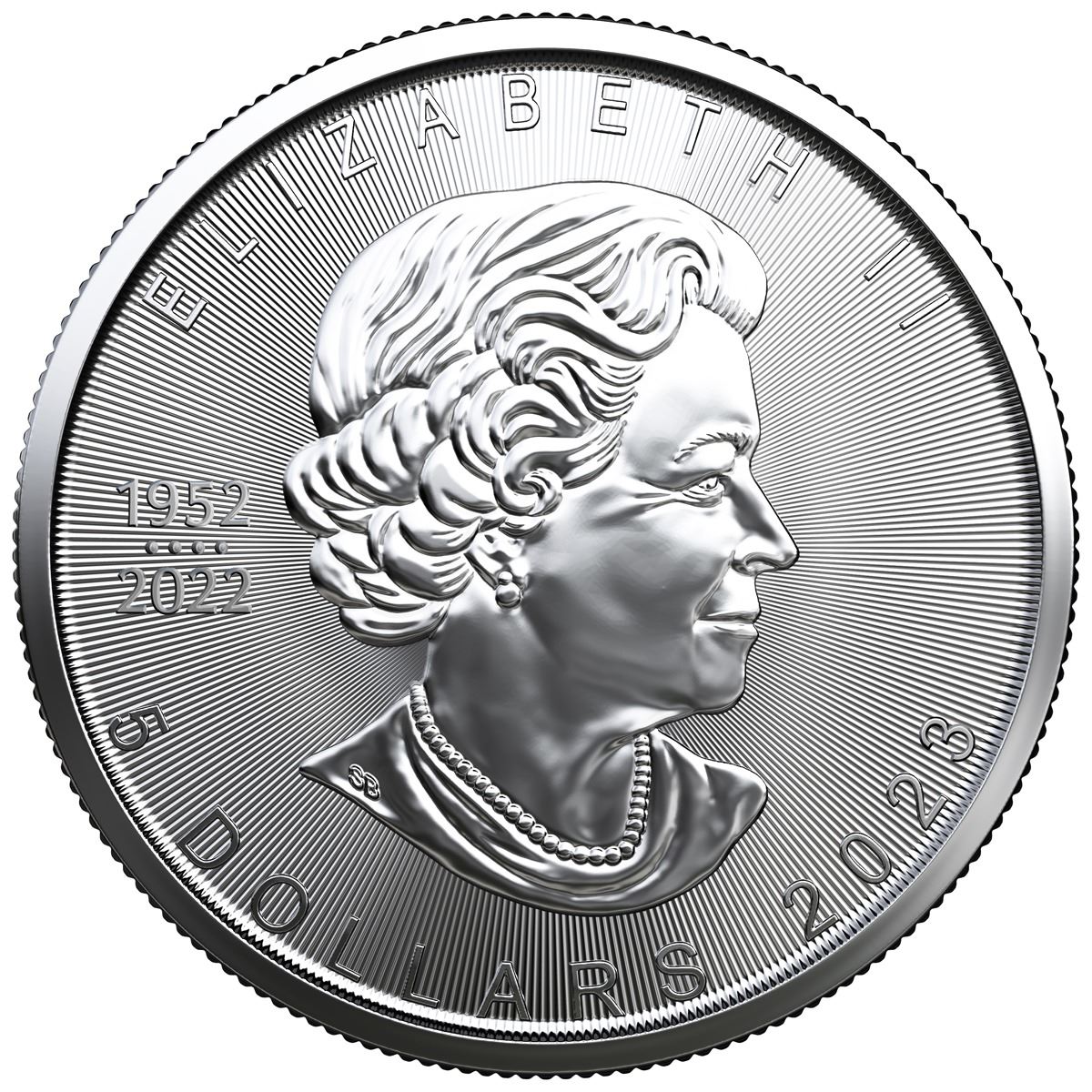 .9999 Fine Pure Silver Maple Leaf $5 Coin  A transitional obverse, Susanna Blunt's classic effigy that has been used on the series since 2003, has been updated to include the dates of her long reign, "1952-2022." This effigy will be used until Buckingham Palace approves the Canadian effigy of King Charles III. Whether this will occur later in 2023, or in 2024, remains unknown. This 2023 Maple Leaf coin is struck from 1 Troy oz. of .9999 fine silver. The bullion coin measures 37.97 mm in diameter. The coin is minted with a breathtaking Brilliant Uncirculated finish. The coin has been treated with the RCM's innovative MintShield™ coating, which has been proven to significantly reduce the development white spots on the surface. The coin features a maple leaf security mark and fields patterned with microscopically thin radial lines to discourage counterfeiting. The coin carries a legal tender value of five dollars in Canada.