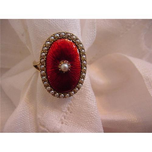 </font></strong>Gorgeous and rare red guilloche enamel and seed pearl ring set in 9K yellow gold. There are twentynine seed pearls bordering the deep orange-red enamel and one collet set seed pearl in the center. Ring measures 7/8" long and 5/8" wide. Size 7. Excellent condition. Circa 1900.</font>