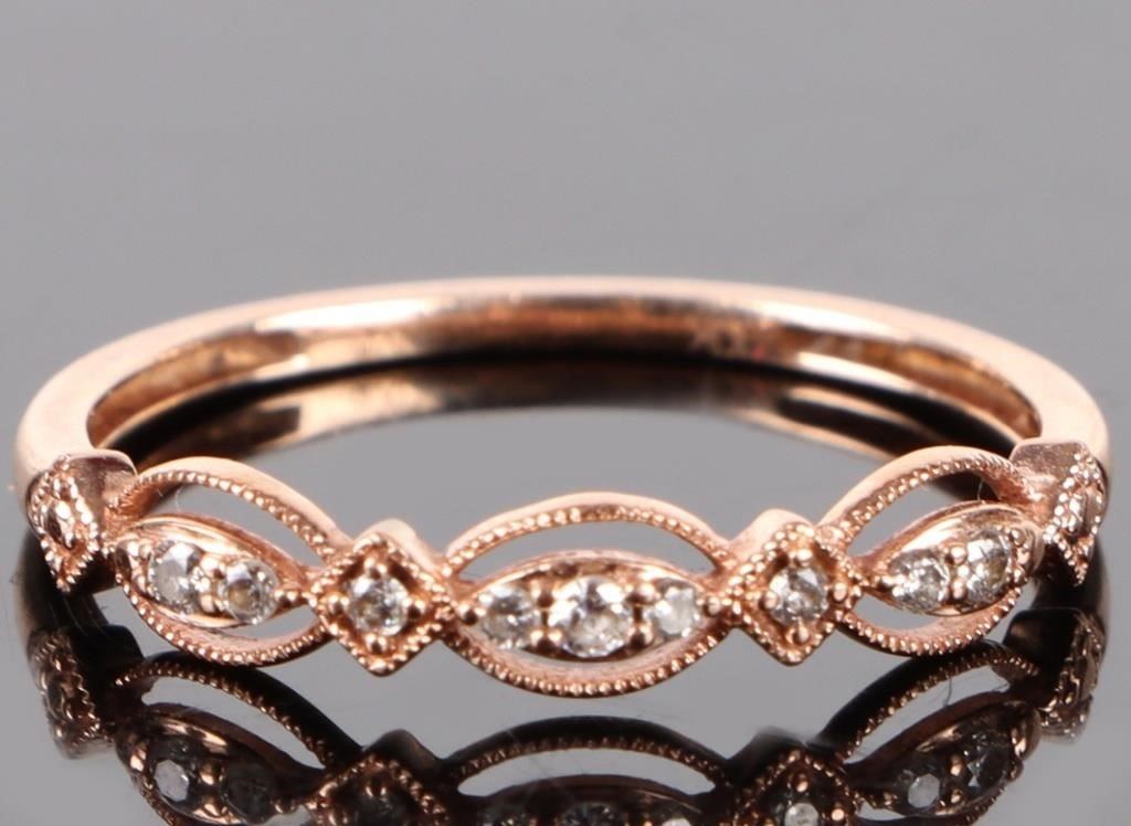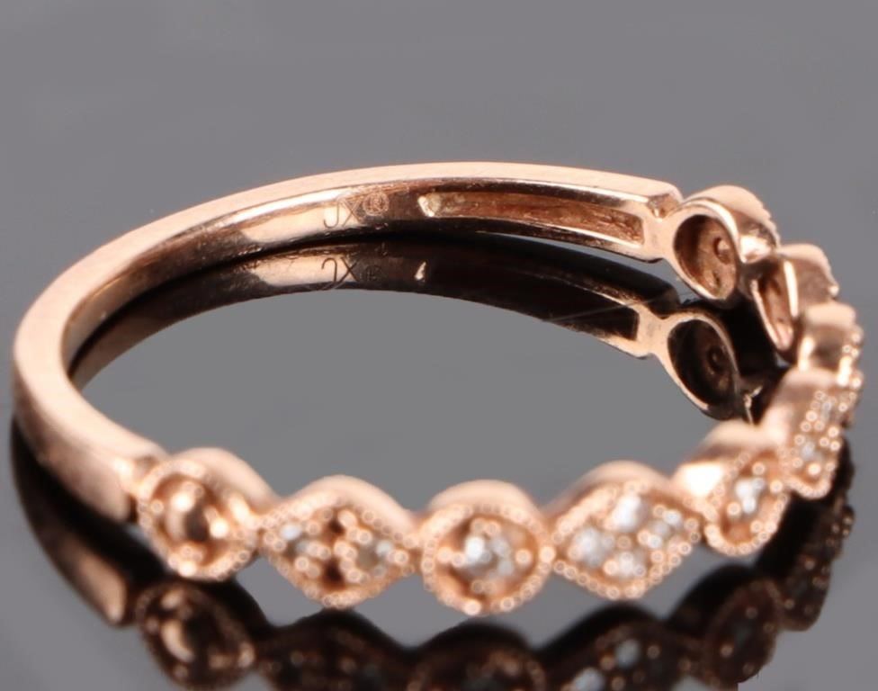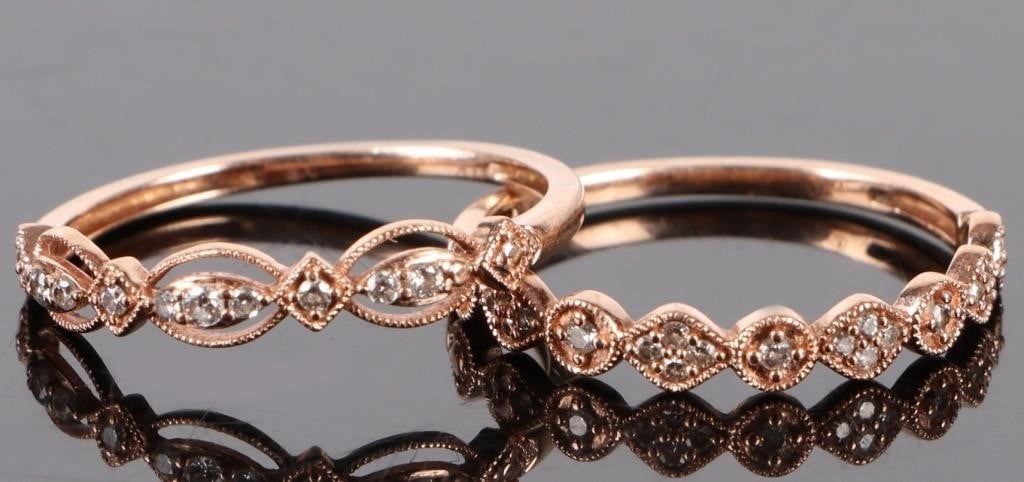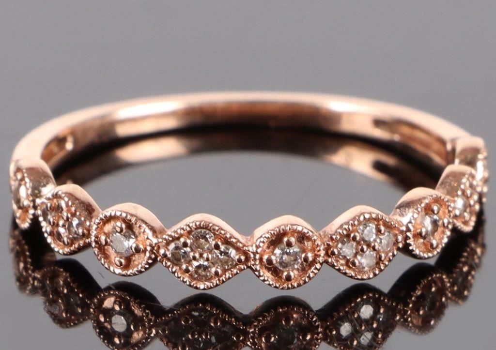 9K rose gold diamond ladies rings to include one ring w/ nine 0.01ct round cut diamonds, and one ring w/ fifteen 0.01ct round cut diamonds.