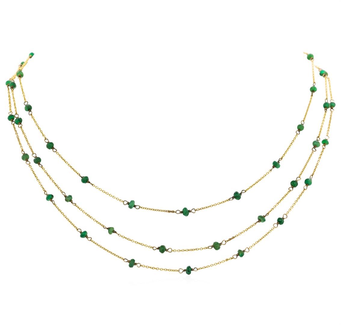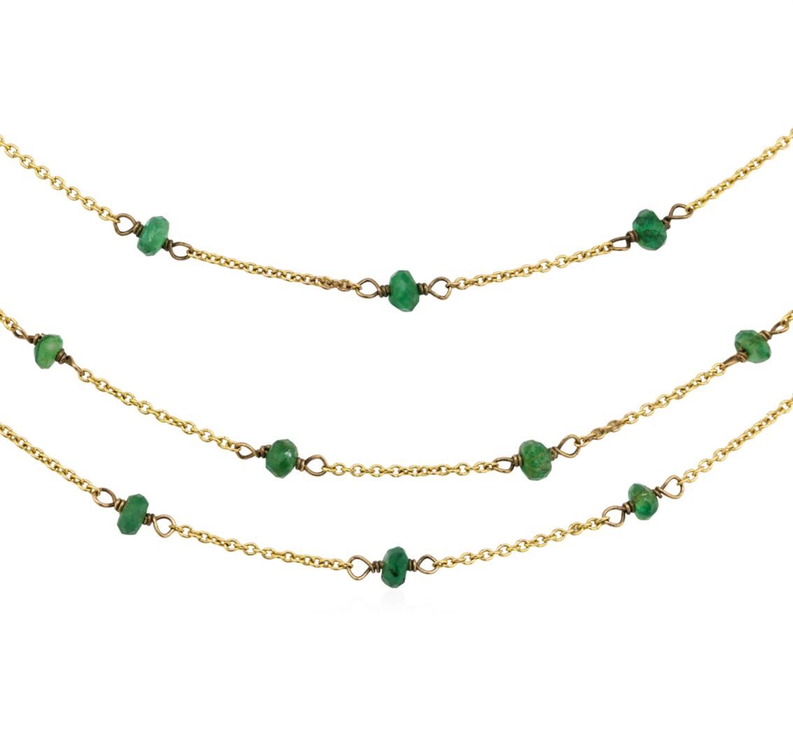One three-strand diamonds by the yard necklace featuring: 9KT yellow gold weighing 6.2 grams containing emeralds weighing 5.00ctw. The necklace measures approximately sixteen inches in length.