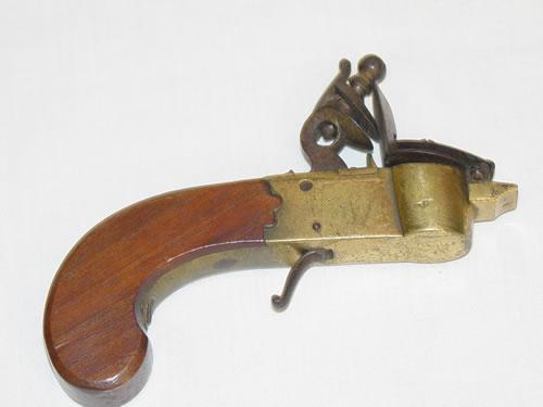9TH CENT. FLINT LOCK STEEL and BRASS TINDER PISTOL W/ WOODEN GRIP, UNMARKED - WITHOUT FLINT, WEAR and IMPERFECTIONS W/ LIGHT SURFACE PITTING