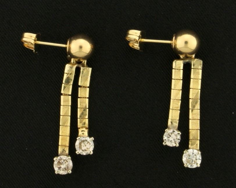 In 14k yellow gold. Each earring contains one .23ct and one .22ct high quality diamonds, SI clarity/I color. 1 1/4" long with friction backs. 4.2g.