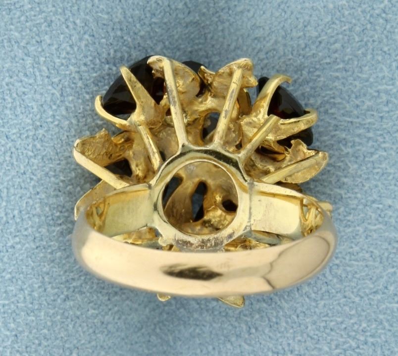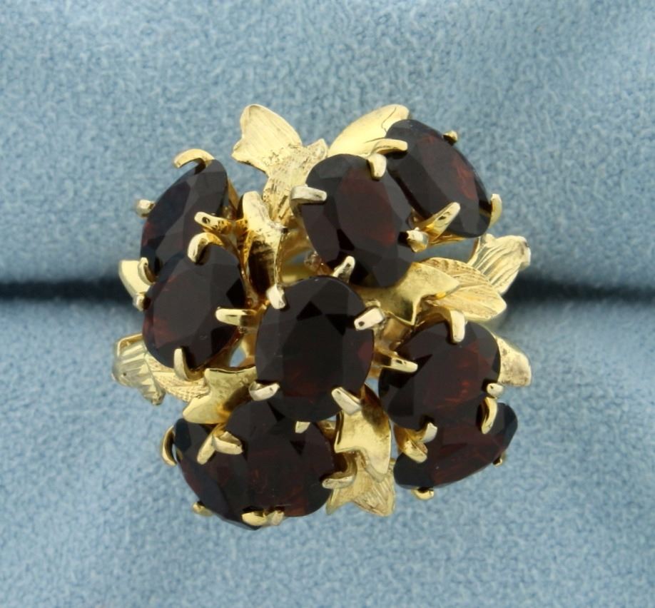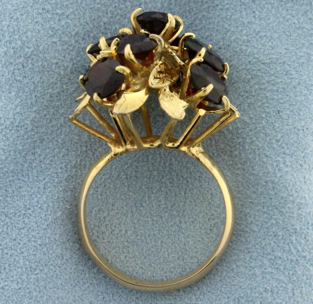 In 14k yellow gold. Contains nine 1ct oval shaped natural garnet gemstones with excellent color and clarity. Size 7 1/2. 8.4g.