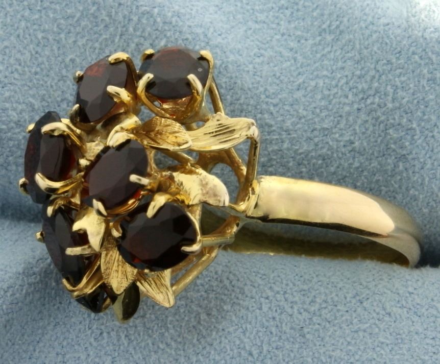 In 14k yellow gold. Contains nine 1ct oval shaped natural garnet gemstones with excellent color and clarity. Size 7 1/2. 8.4g.