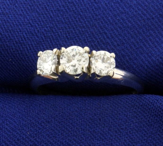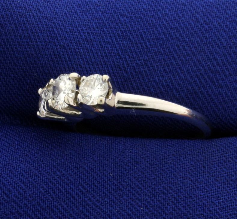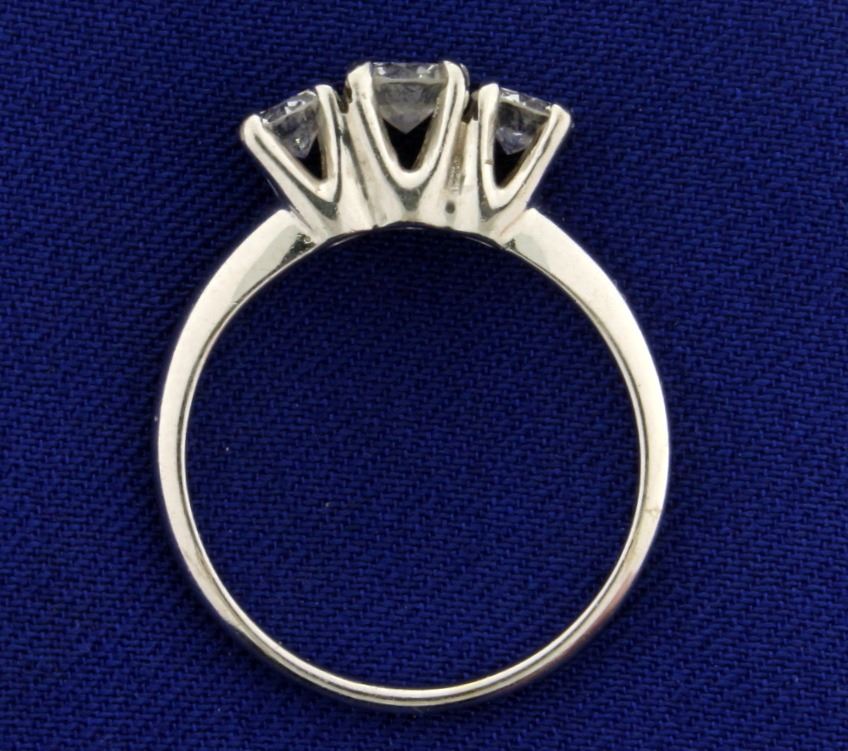In 14k white gold, containing a center diamond that is .38ct surrounded by two .26ct Diamonds. All very high quality VS clarity/G color. Size 7 1/4. 3.0g.