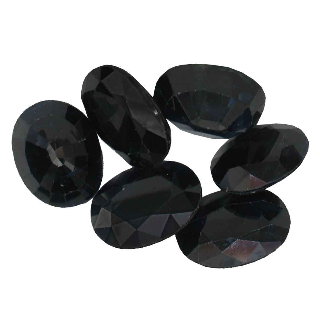 Six oval mixed cut natural blue sapphires, measuring 8.00 x 6.00 x 4.00mm, exact total weight 9.00ct., clarity is heavily included, type II, very dark, very slightly grayish, blue color, (GIA B 8/3), cut is good. Measurements are an average for the group. Transmitting light diffusely, opaque. Naturally occurring internal & external characteristics are present. Indications of multiple laboratory enhancements. Westfield Appraised at $1,040.00.