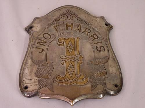 9" SHIELD SHAPED ENGINE PLATE ENGRAVED JNO. F. HARRIS #1 - MINOR NORMAL WEAR;