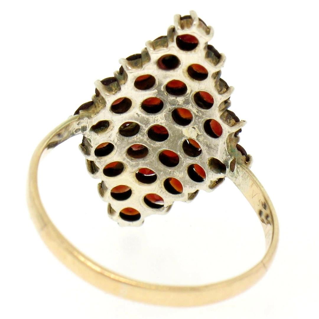 One Antique 9k Yellow & White Gold 1.5ctw Rose Cut Deep Red Garnet Cluster Ring. Item Details: Material: Solid 9k Yellow and White Gold, Weight: 1.7 Grams, Stone(s): (25) Natural Genuine Garnets - Round Rose Cut - Prong Set - Deep Rich Red Color - 1.5ctw (approx.), Total Carat Weight: 1.50 (approx.), Ring Size: 6.0 (We can custom size this ring.), Ring Width: 20.36mm, Ring Height: 2.97mm rise off the finger, Condition: Antique Ring - Original Patina - Can Be Polished to New if Desired - Ready to Wear!
