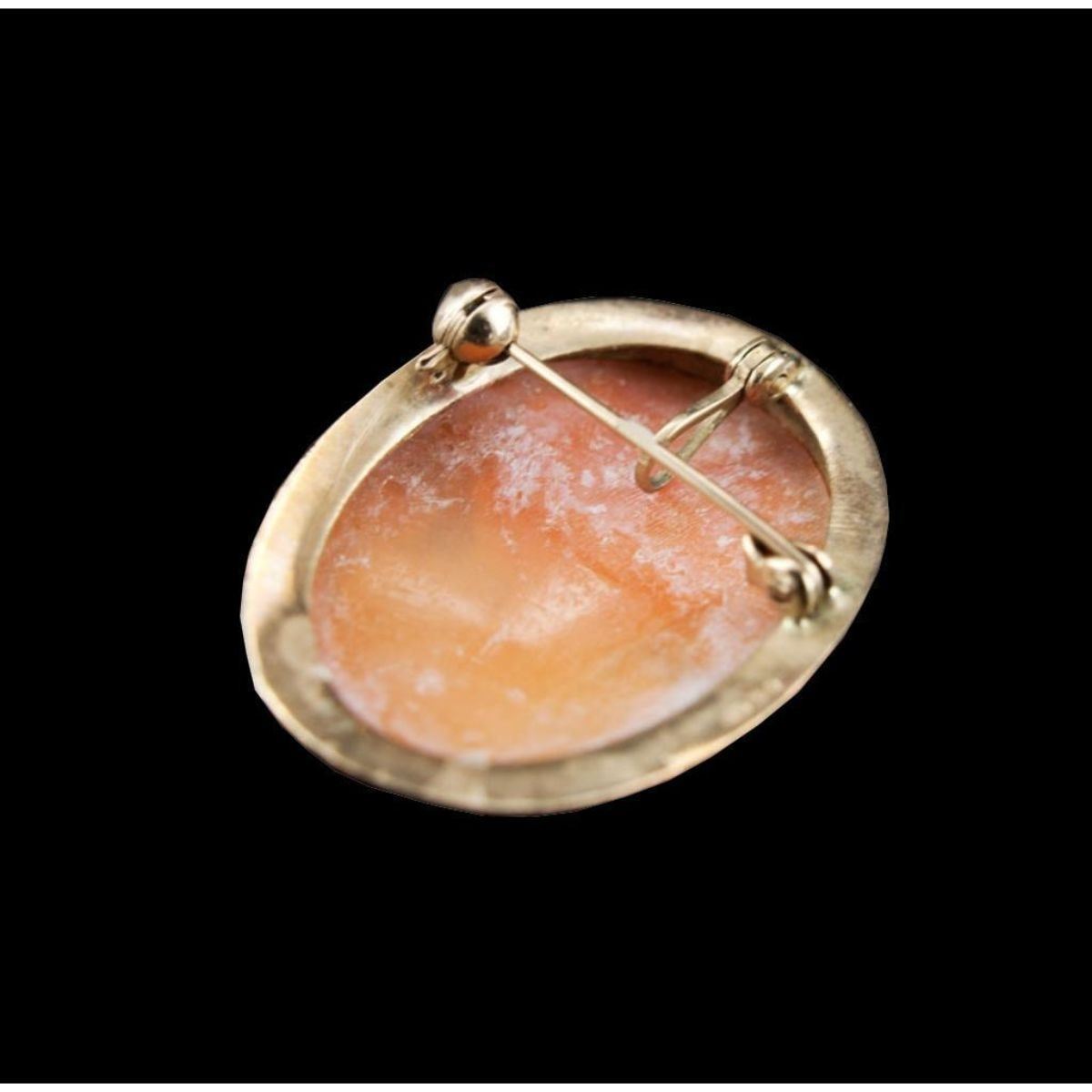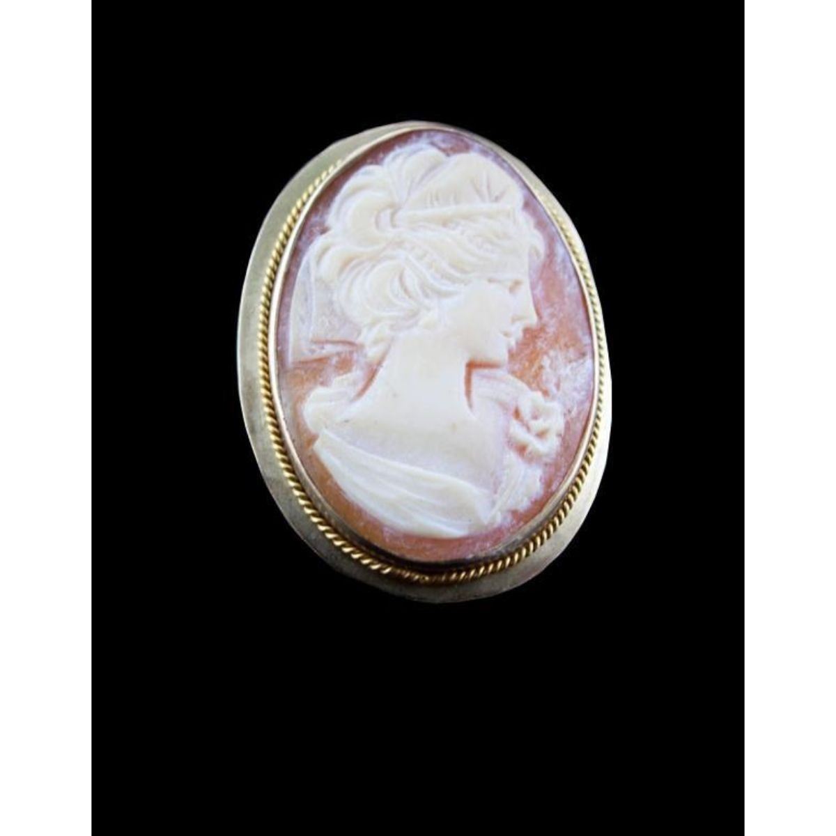 Lovely shell cameo, depicting a lady with flowers. Hallmarked on the reverse. Set into a 9kt yellow gold brooch pin. Pinback in perfect condition & swing latch style loop for conversion into a pendant or enhancer. 1 1/8" H X 7/8" W