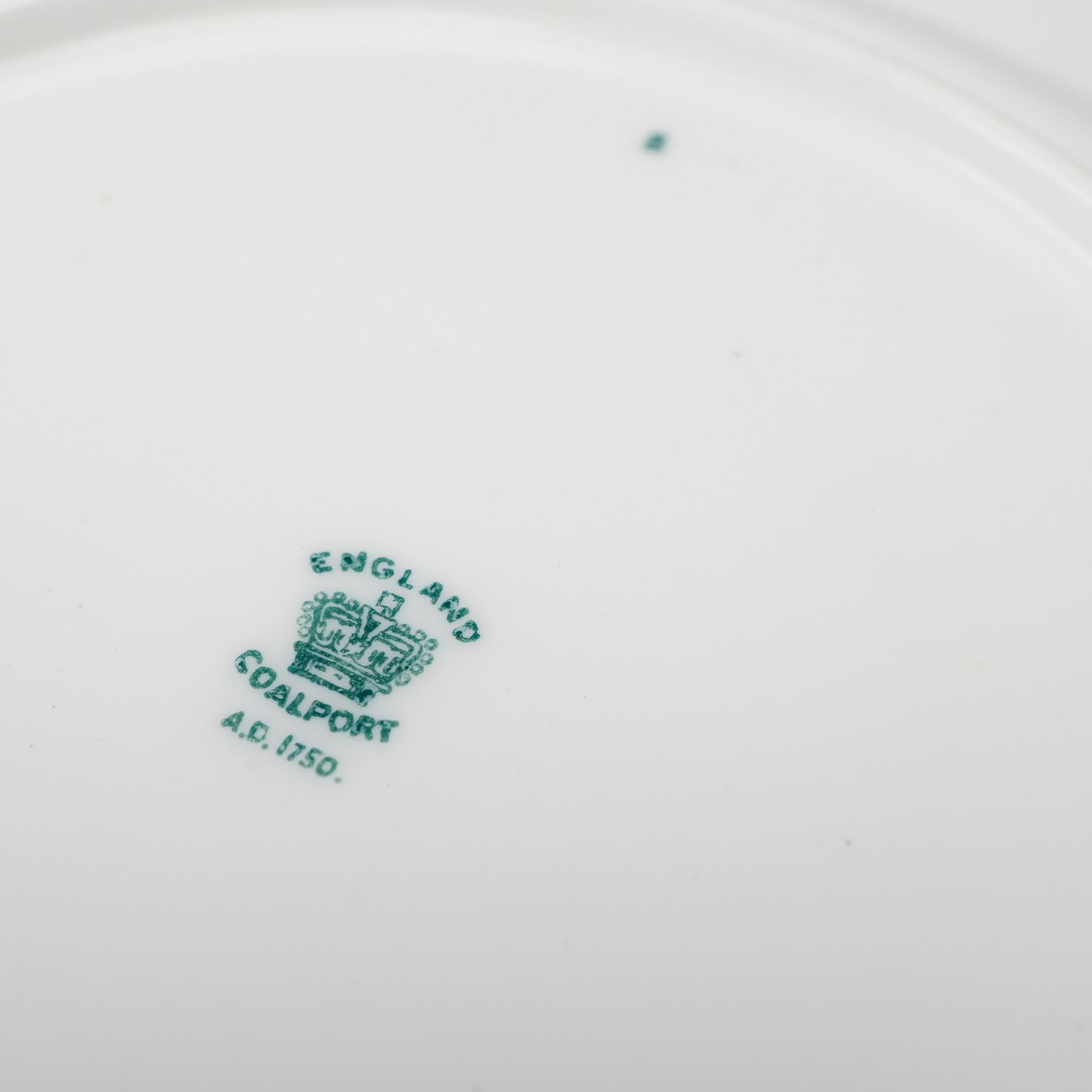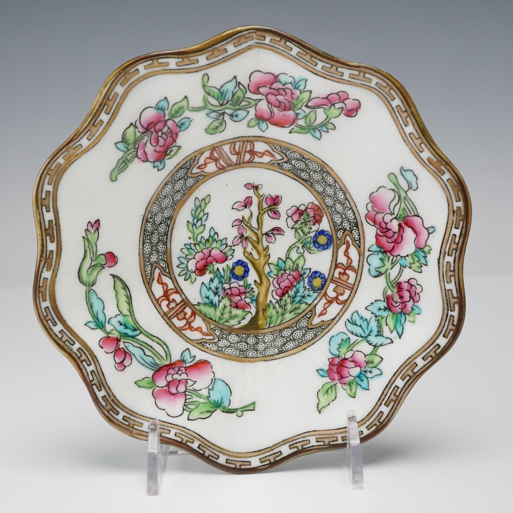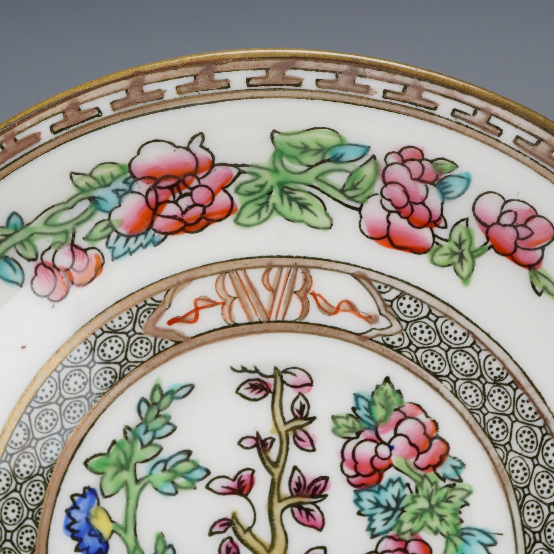Charming saucers and bread plates in the vibrant Indian Tree Multicolor pattern. This nine-piece set features richly enameled floral and foliate motifs in shades of rose, turquoise, green, and cobalt, accented with fine gilt borders. The group includes both round and scalloped edge forms, displaying Coalport's refined craftsmanship and timeless Oriental-inspired design. Each piece is marked to the underside Coalport, England.