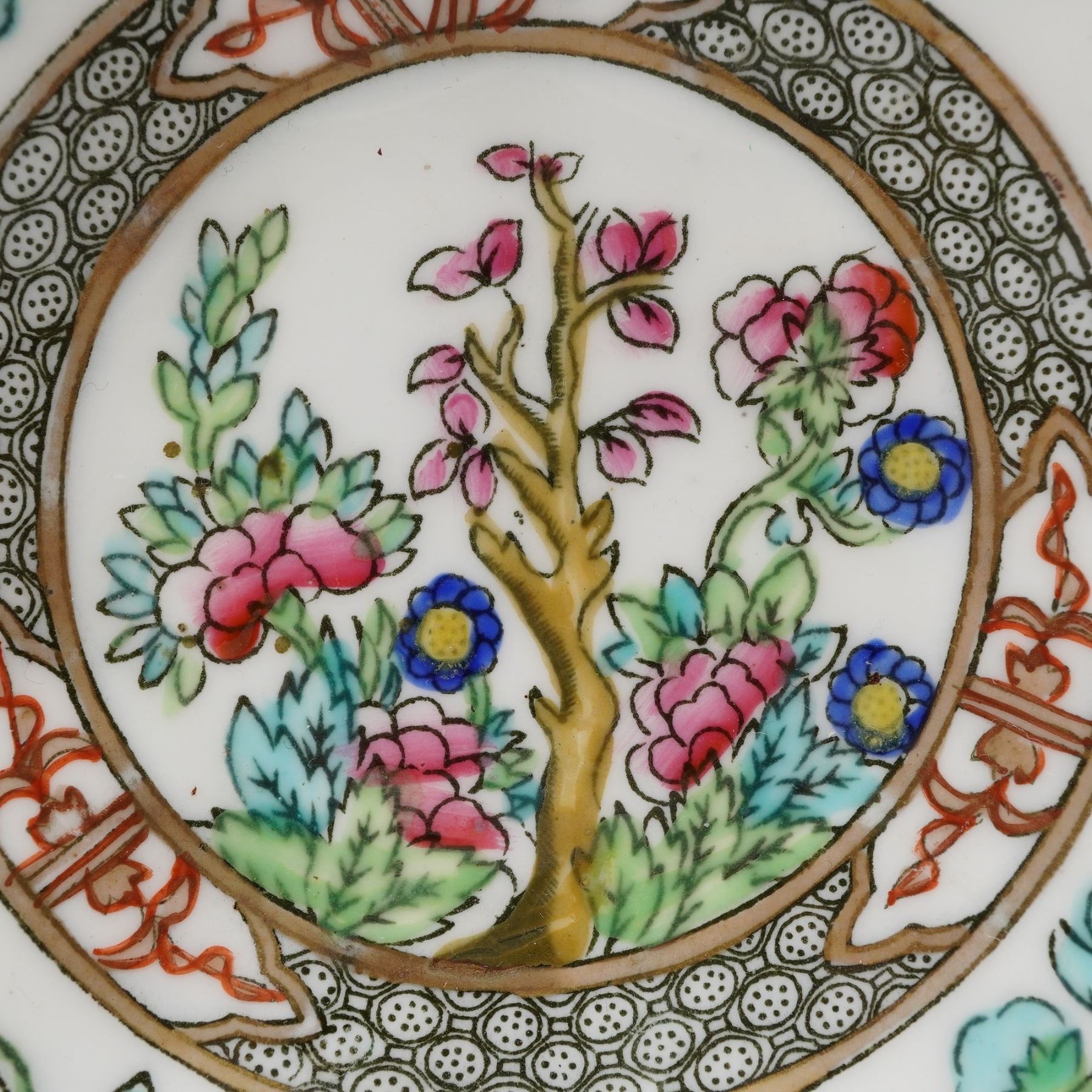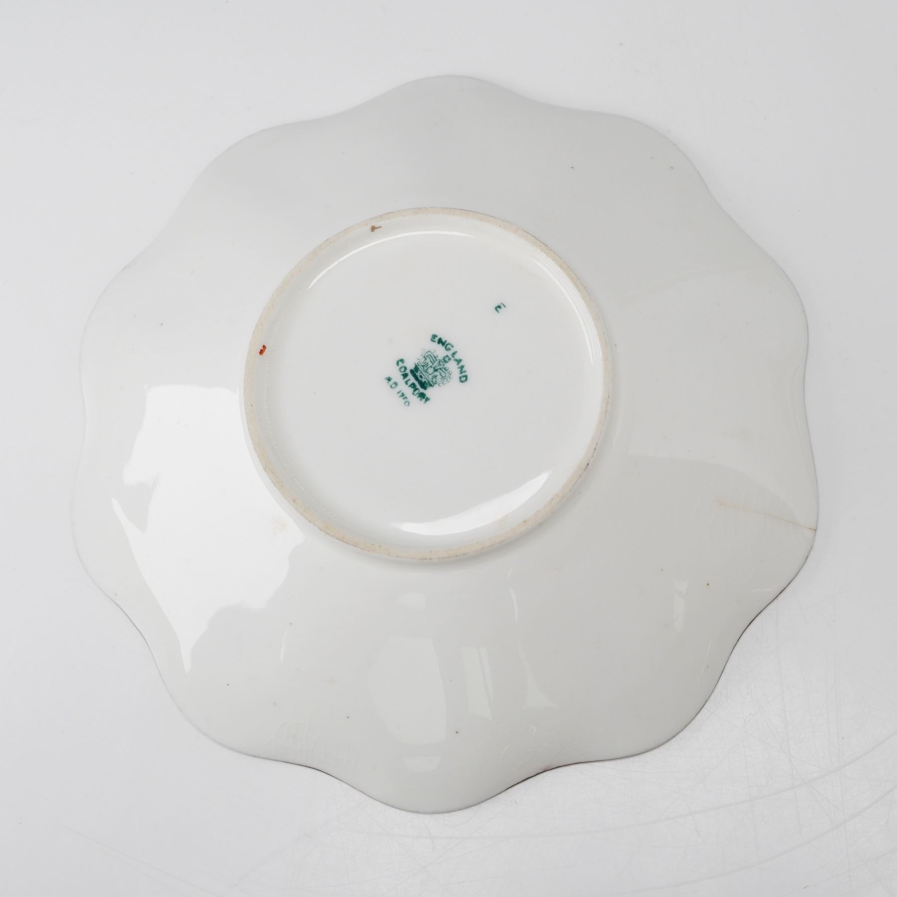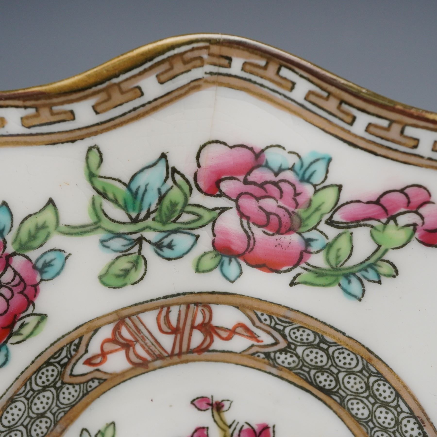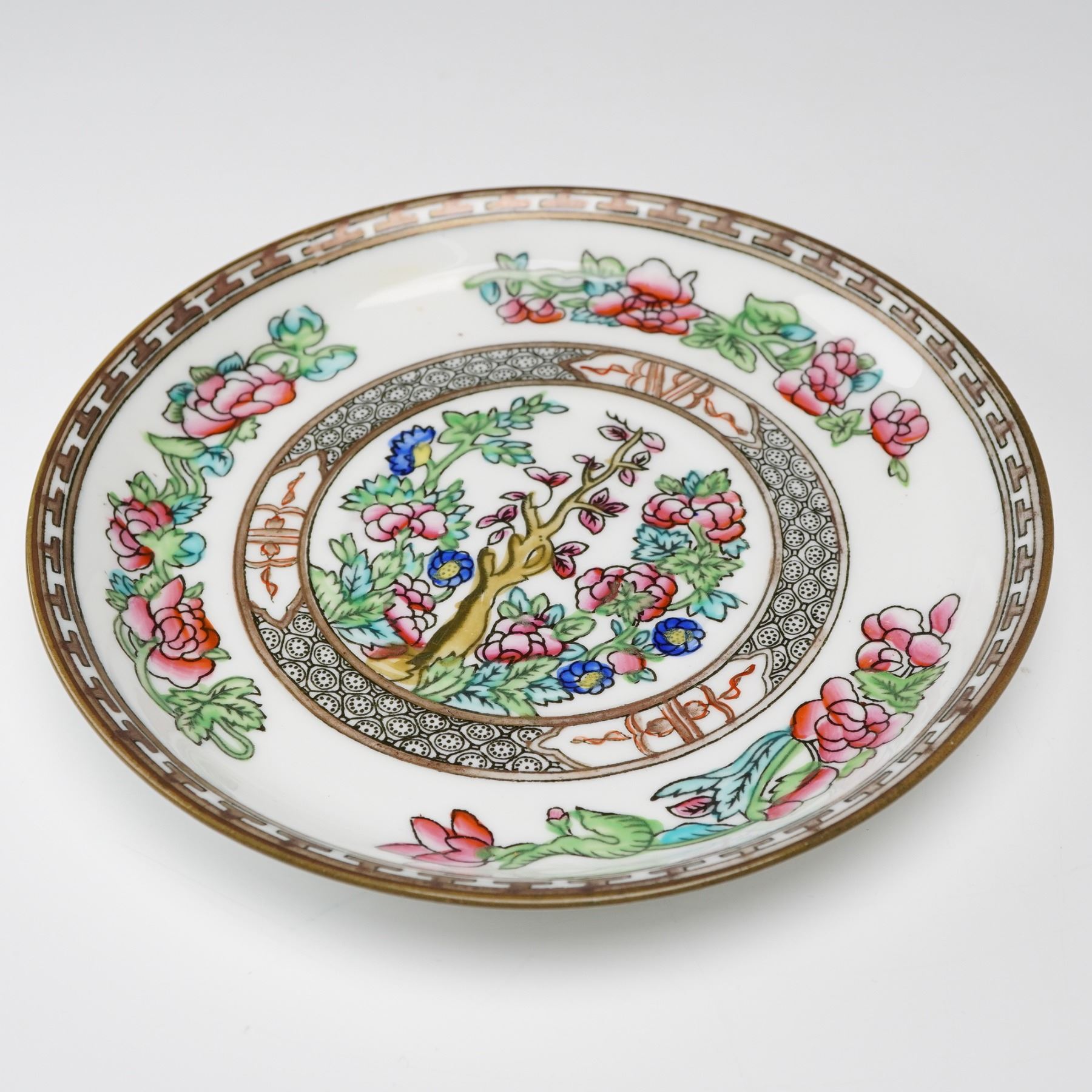 Charming saucers and bread plates in the vibrant Indian Tree Multicolor pattern. This nine-piece set features richly enameled floral and foliate motifs in shades of rose, turquoise, green, and cobalt, accented with fine gilt borders. The group includes both round and scalloped edge forms, displaying Coalport's refined craftsmanship and timeless Oriental-inspired design. Each piece is marked to the underside Coalport, England.