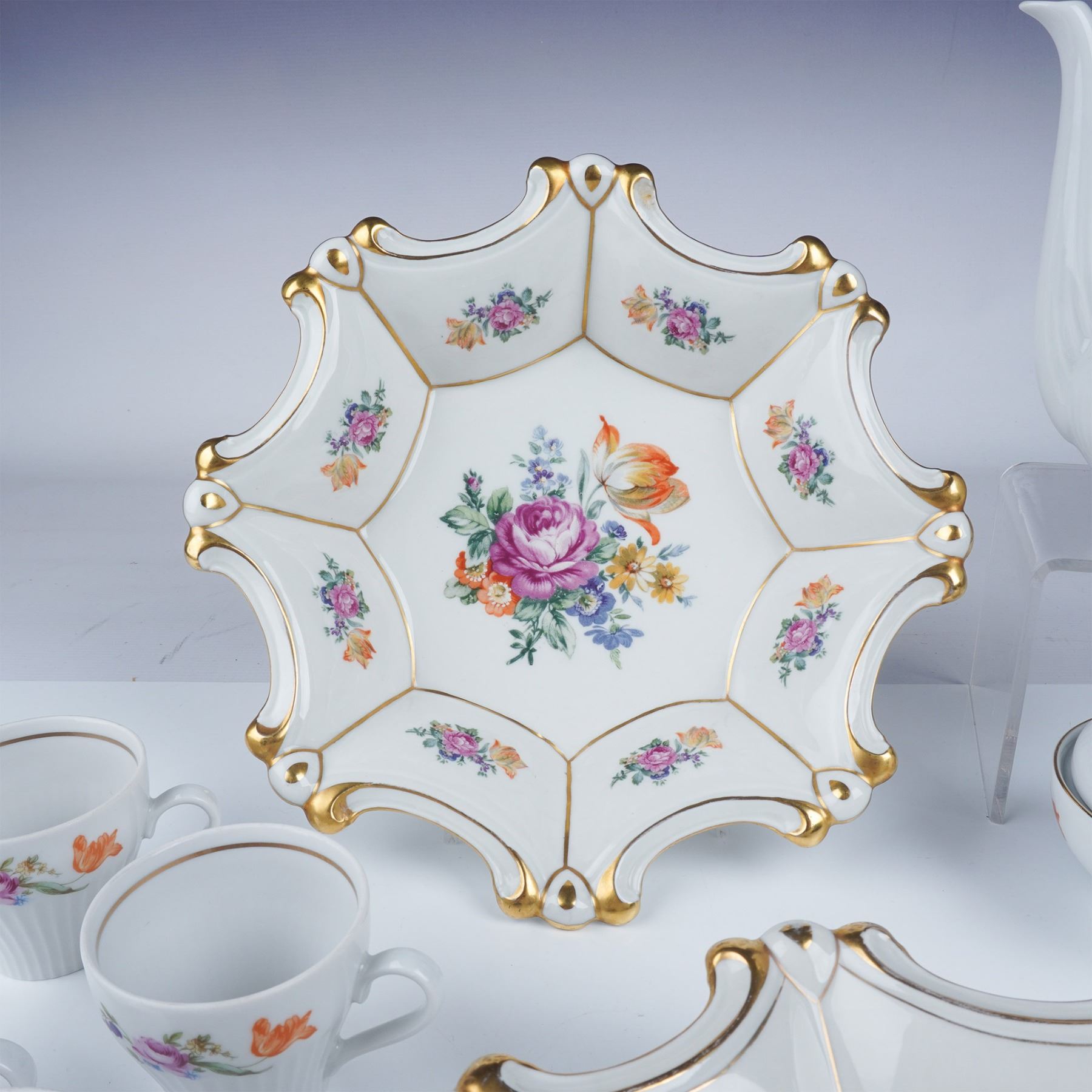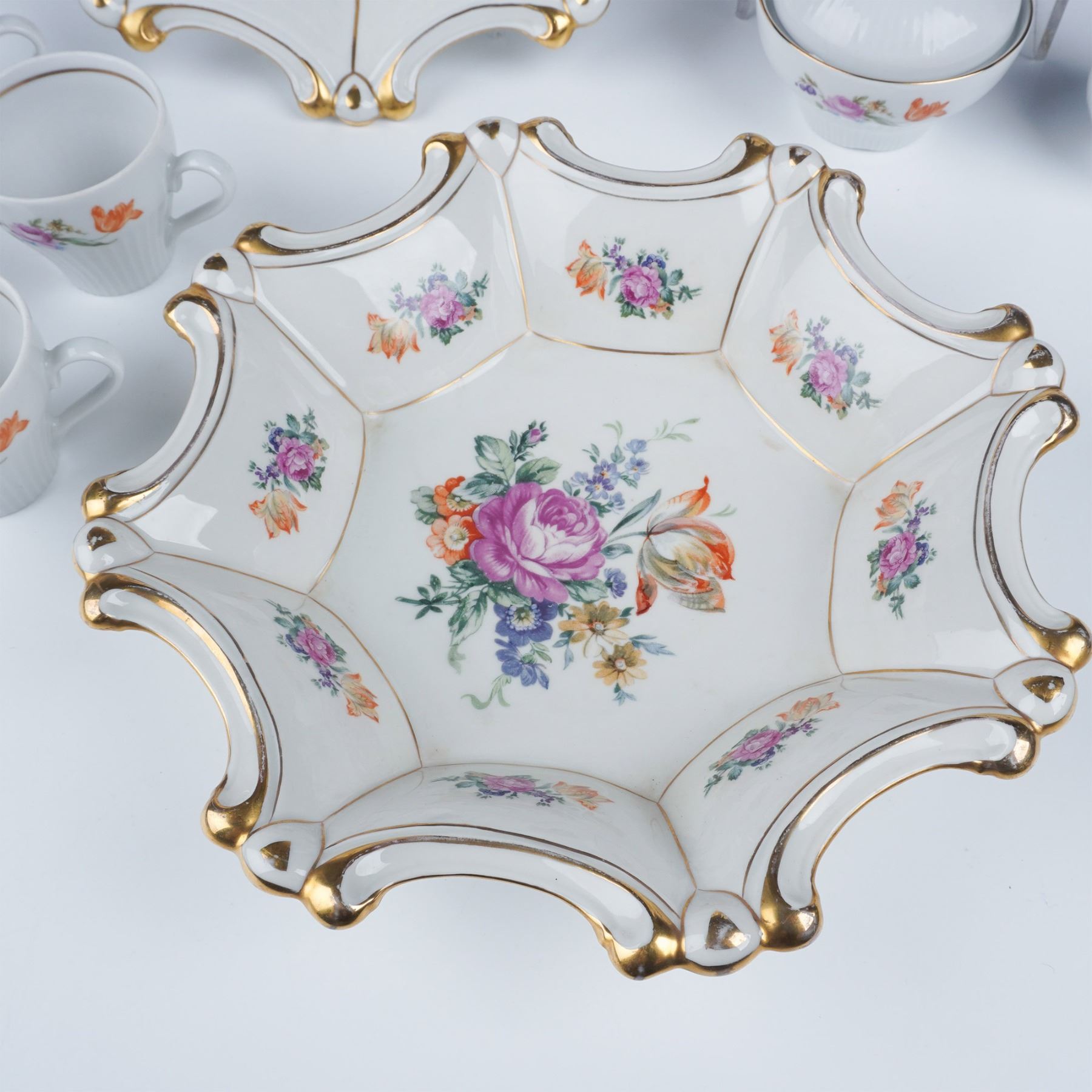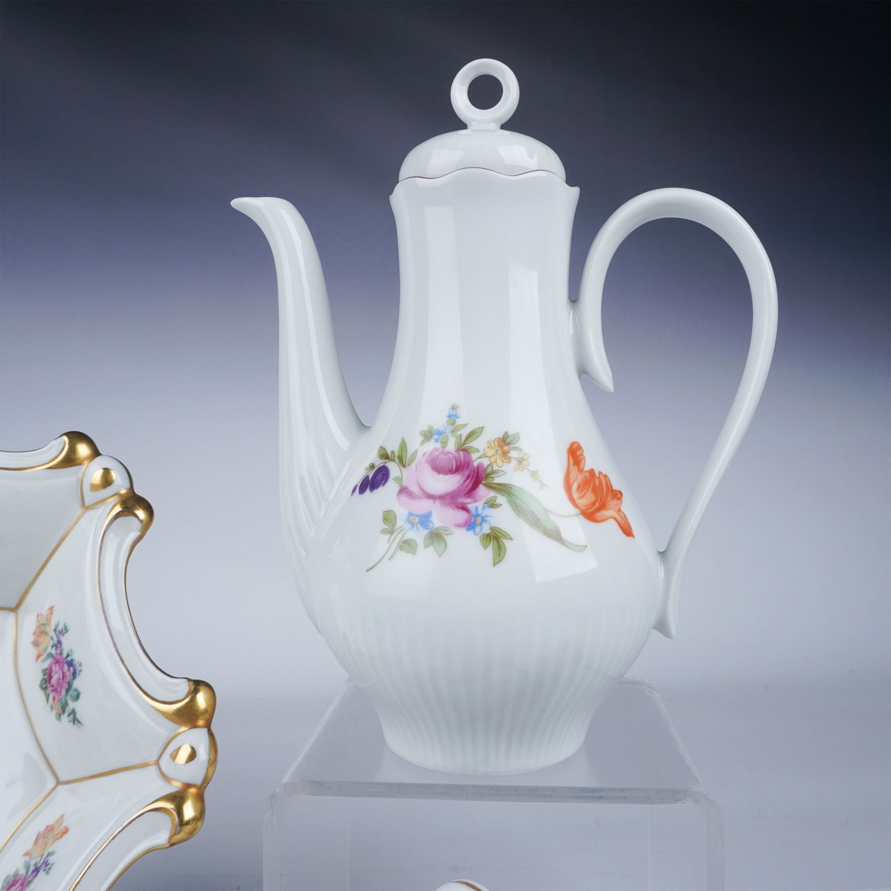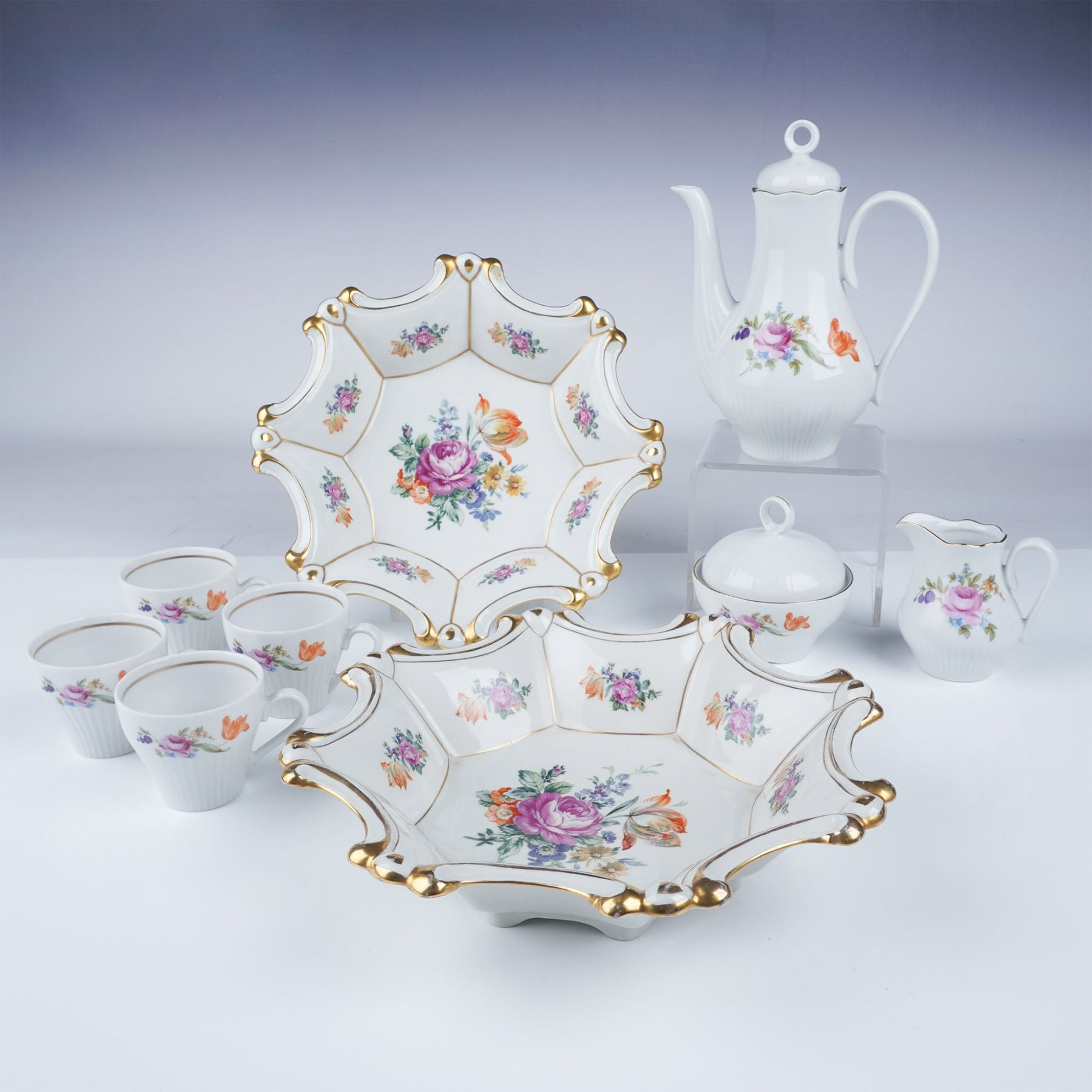 A stunning 9 piece porcelain set designed by Graf Von Henneberg from Ilmenau, Germany. Featuring a beautiful floral and rose pattern accented with elegant gold-metallic trim. This delicate collection includes a covered coffee pot, a covered sugar bowl, a creamer, four espresso cups, and two octagon-shaped serving bowls. Each piece showcases intricate floral designs and gilded accents, highlighting the timeless craftsmanship of Graf Von Henneberg. Perfect for collectors or for adding a touch of sophistication to any table setting. Graf Von Henneberg backstamps. Pattern HEP54. The tallest piece measures: 7.75"H. The widest measures: 10.25"W.