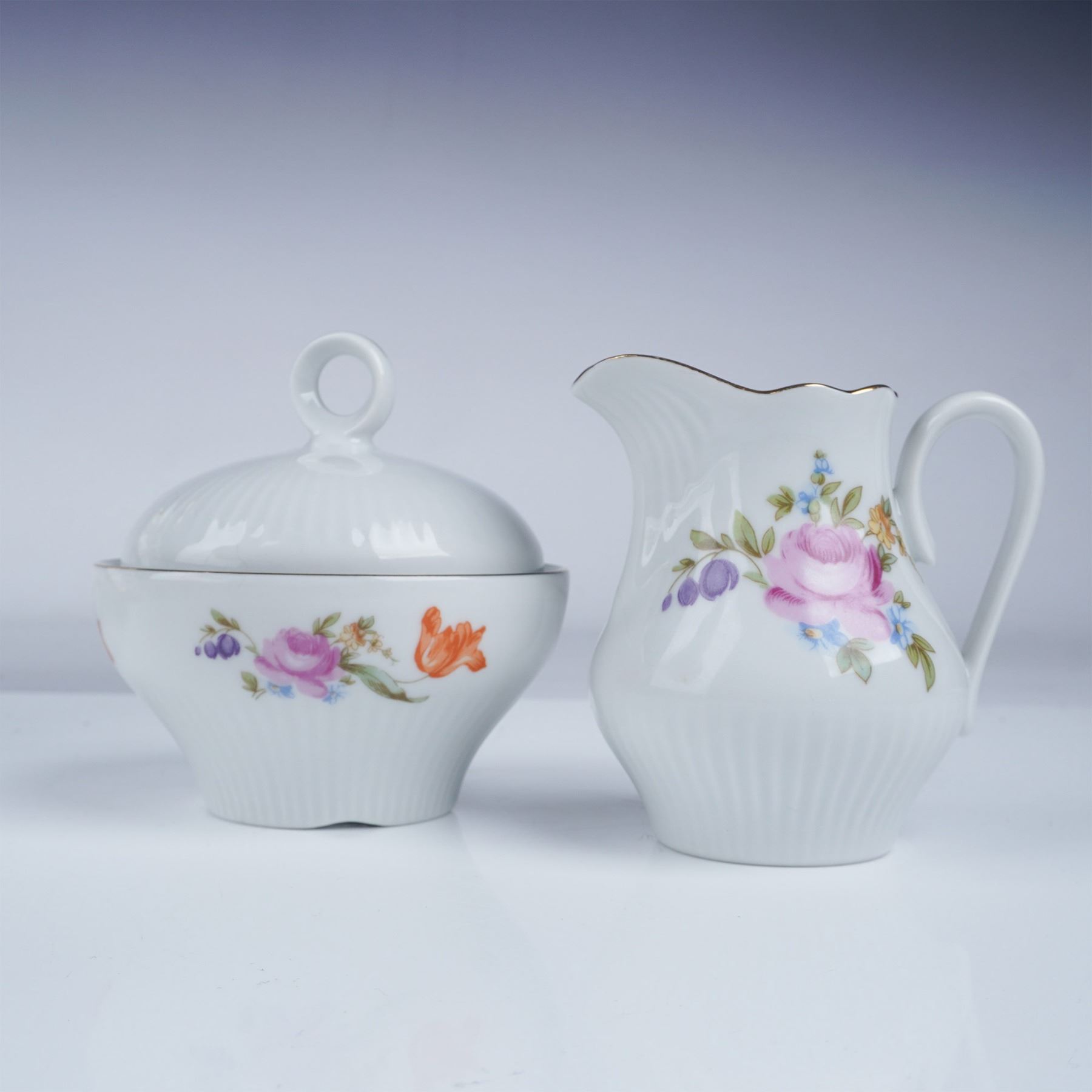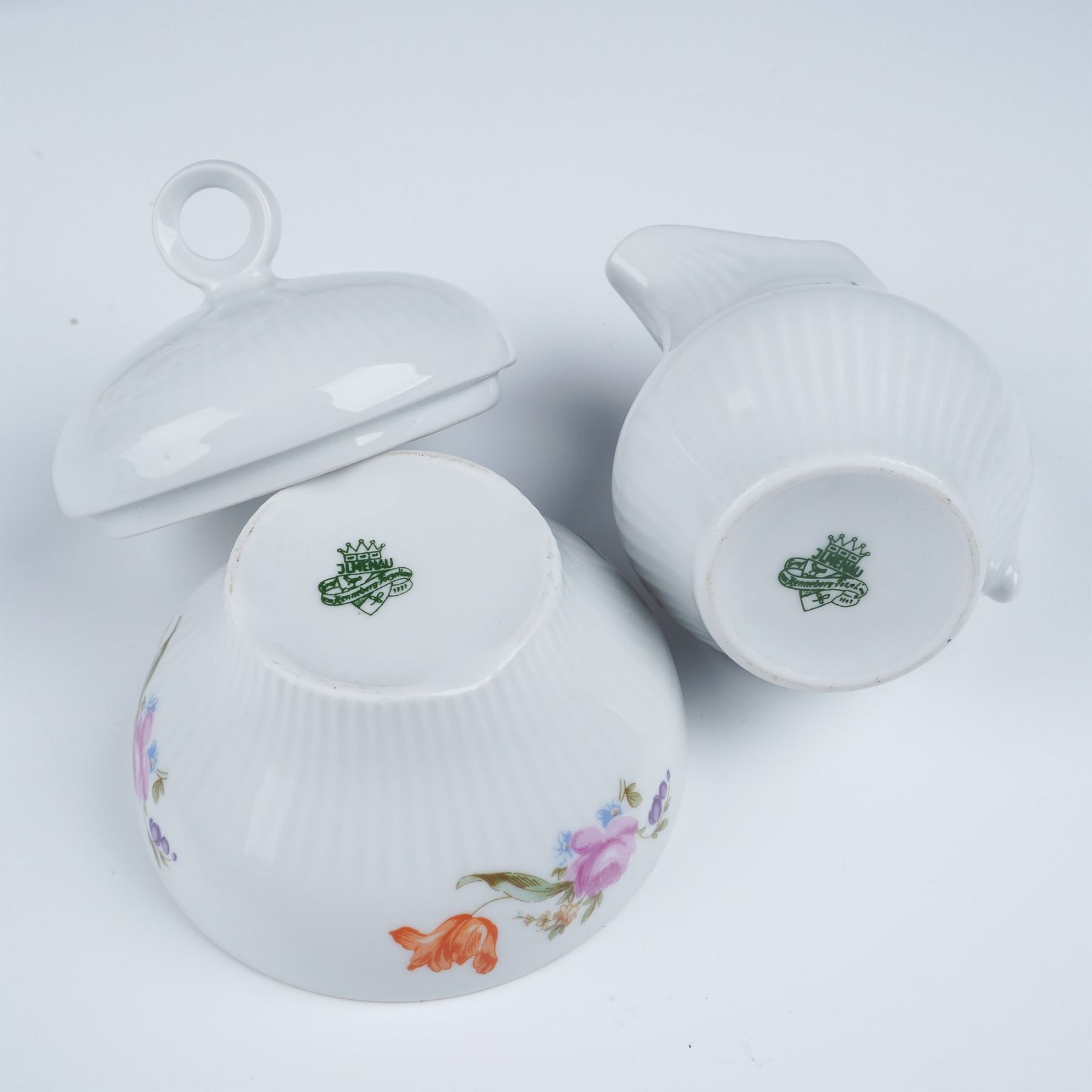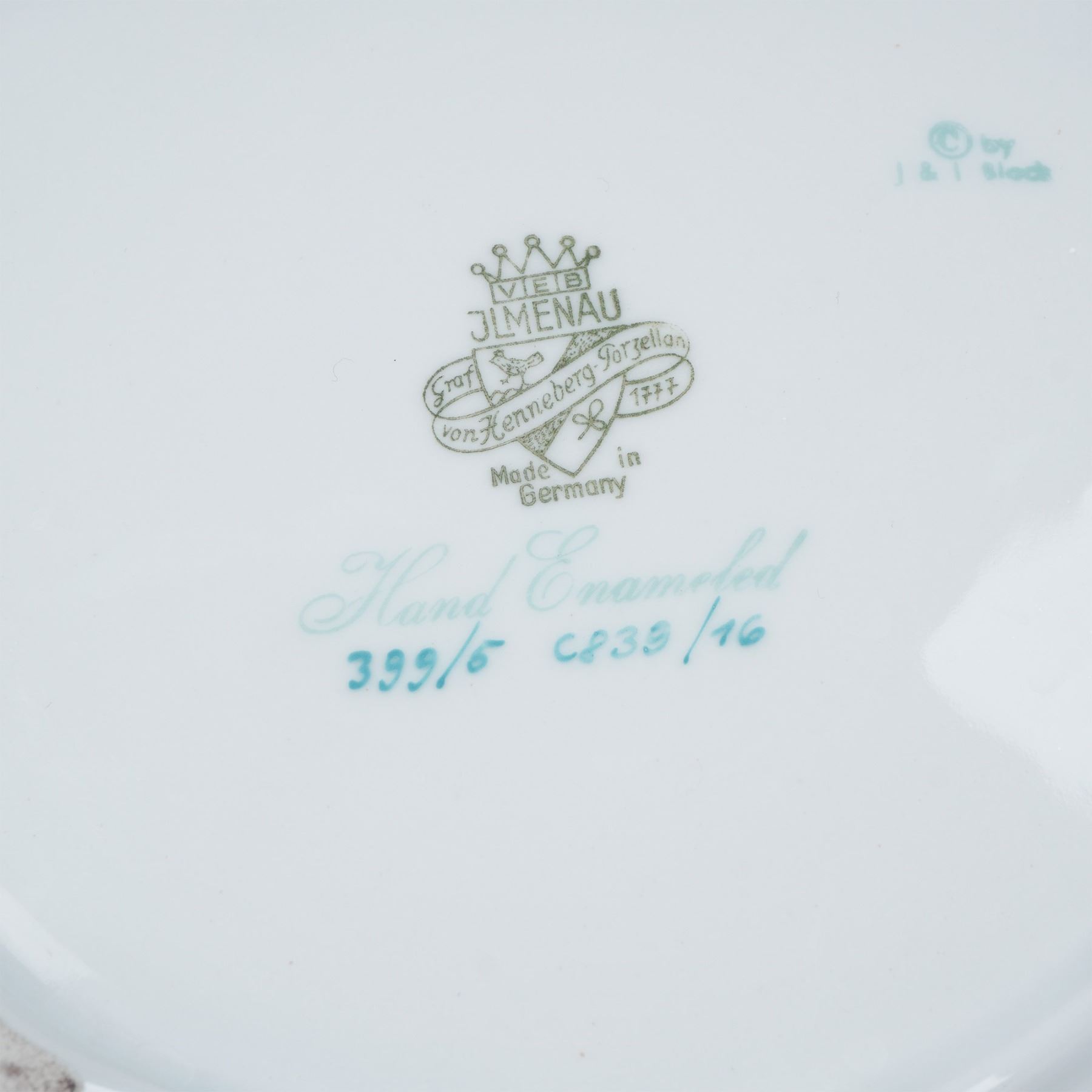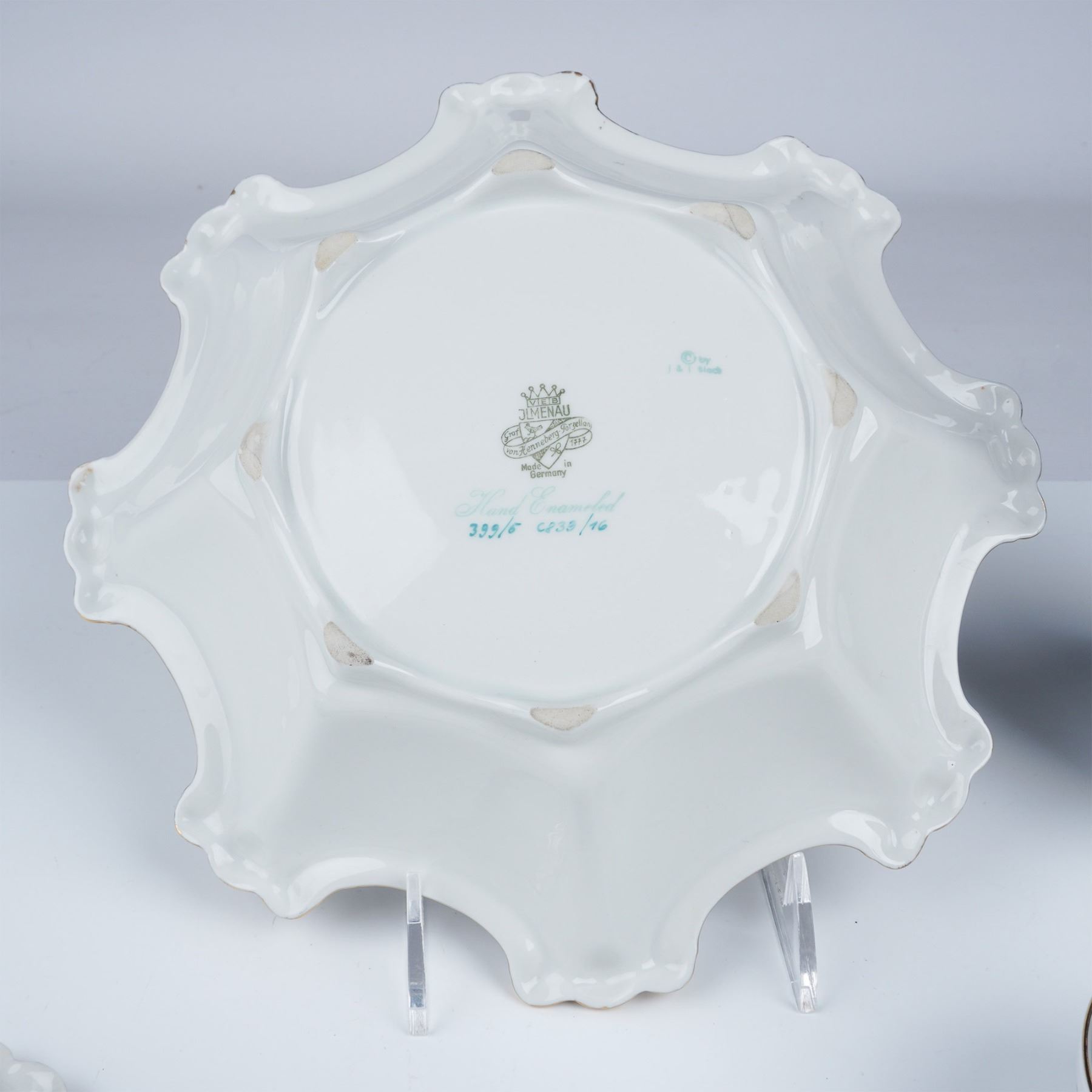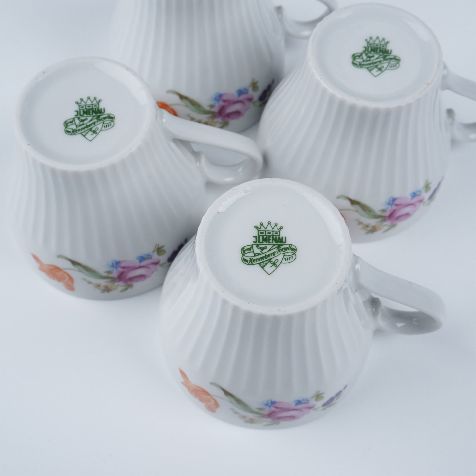 A stunning 9 piece porcelain set designed by Graf Von Henneberg from Ilmenau, Germany. Featuring a beautiful floral and rose pattern accented with elegant gold-metallic trim. This delicate collection includes a covered coffee pot, a covered sugar bowl, a creamer, four espresso cups, and two octagon-shaped serving bowls. Each piece showcases intricate floral designs and gilded accents, highlighting the timeless craftsmanship of Graf Von Henneberg. Perfect for collectors or for adding a touch of sophistication to any table setting. Graf Von Henneberg backstamps. Pattern HEP54. The tallest piece measures: 7.75"H. The widest measures: 10.25"W.