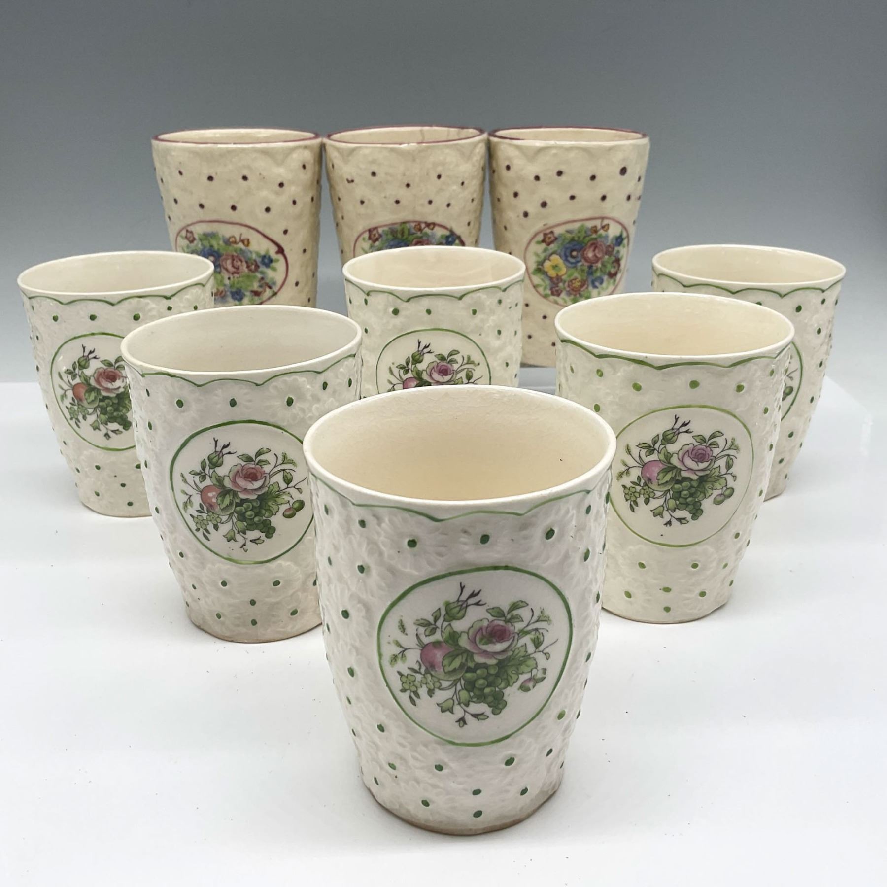Raised design of floral motifs in center medallions. Colored in green, pink and burgundy. Two sizes are included, smaller cup size is 3.75"H and larger cup is 4.25"H. Made in Japan backstamp. Largest piece is 4.25"H x 3" dia.