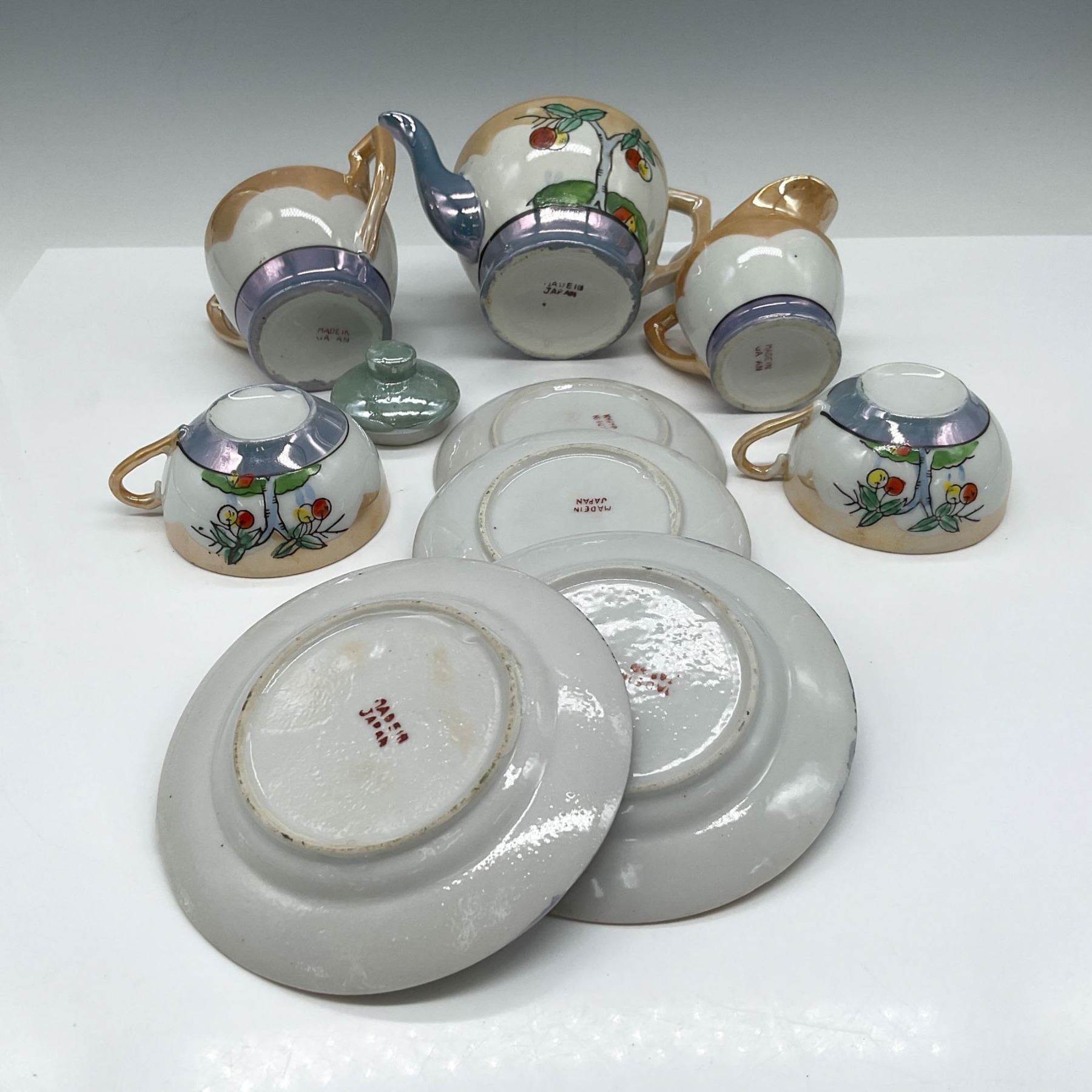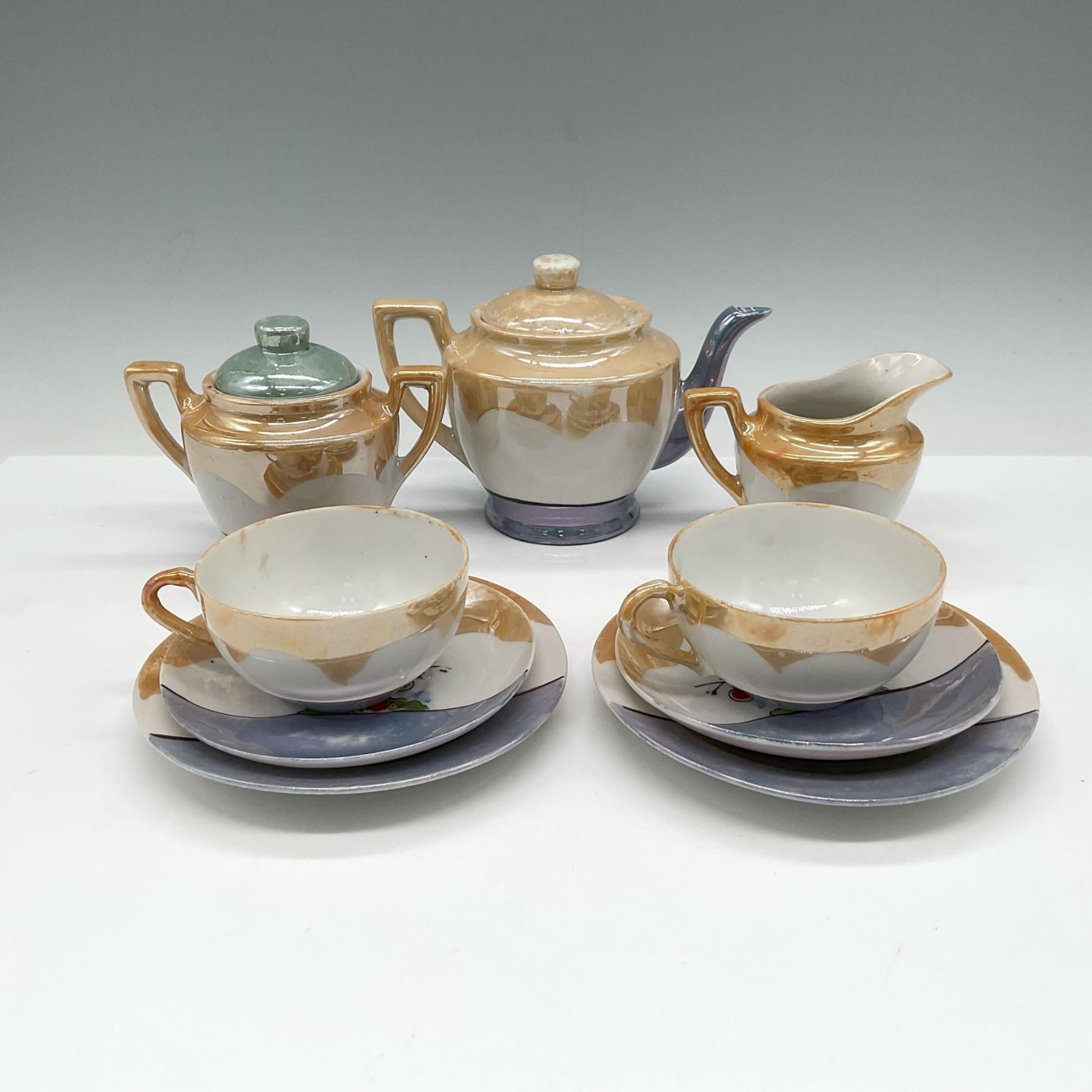 Lovely set with amber, blue and lavender luster glaze over white porcelain, designed with apple tree. Set includes teapot with lid (4"H); sugar bowl with lid (3.5"H); creamer jug (2.75"H); 2 cups; 2 saucers (4"dia.); and 2 dessert plates (4.5" dia.). Made in Japan backstamp. Largest piece 5.25"L x 3"W x 4"H.