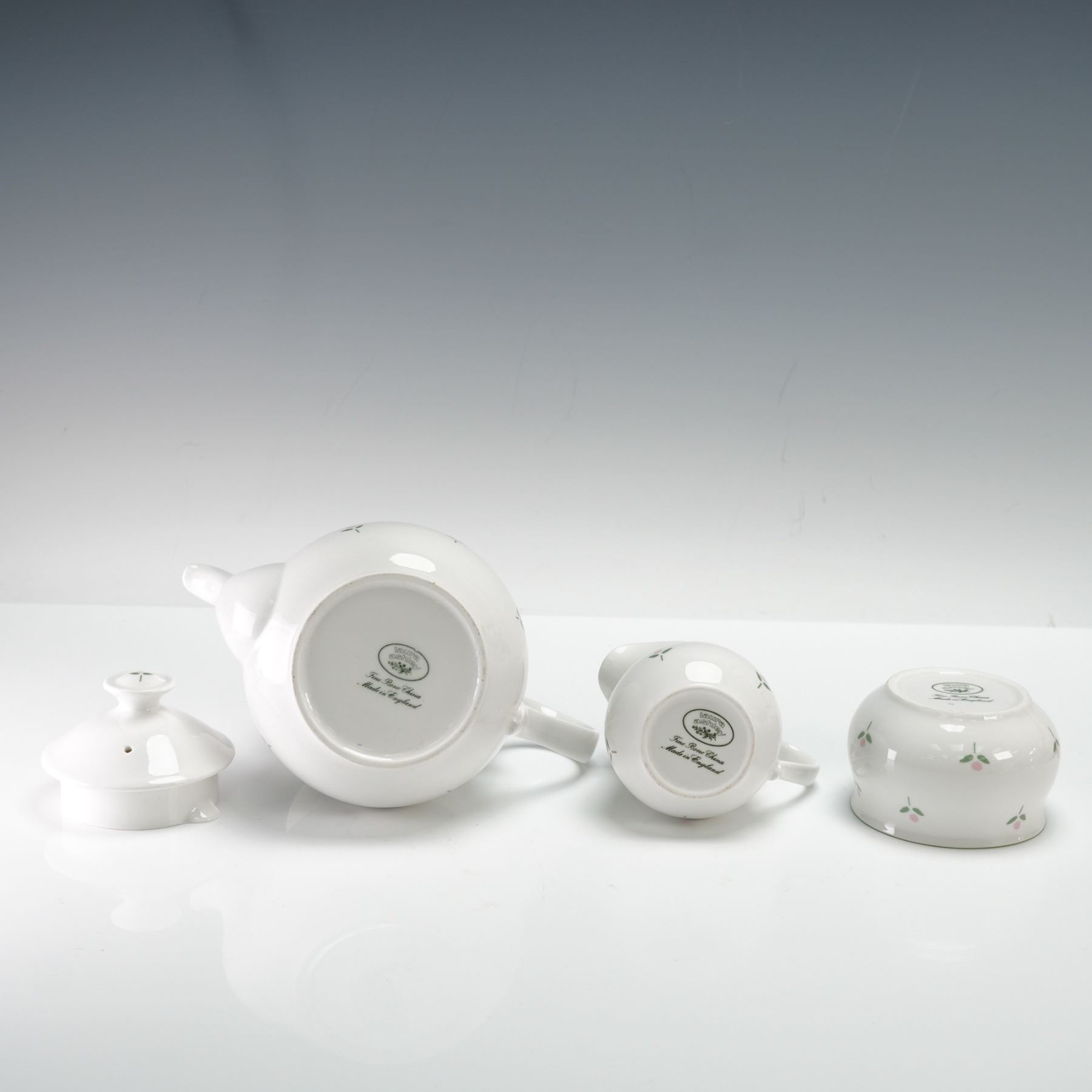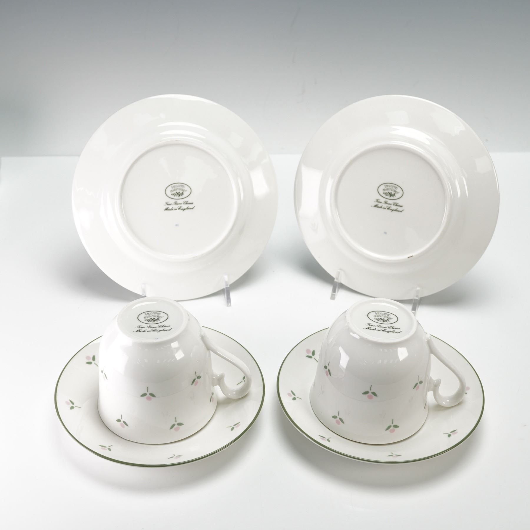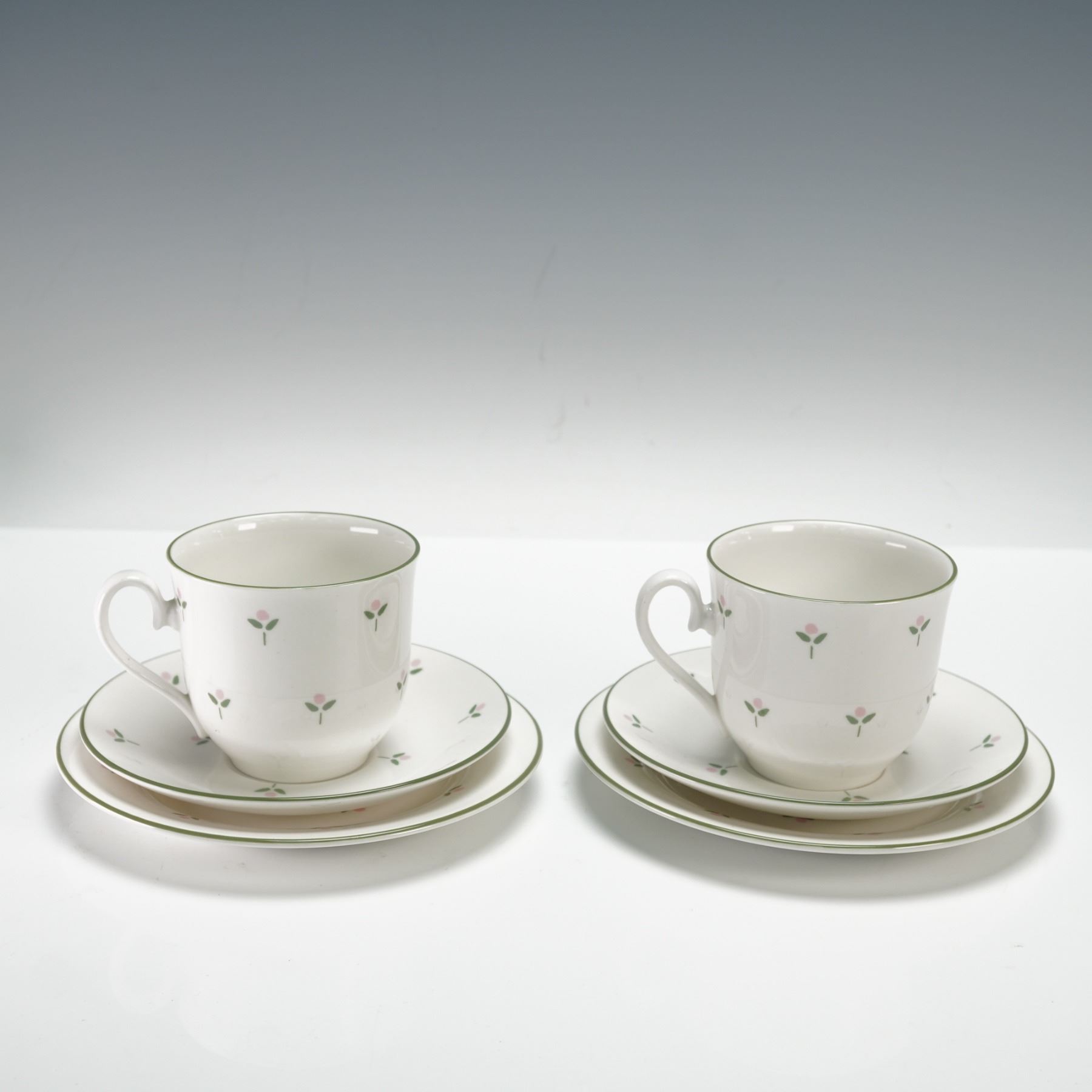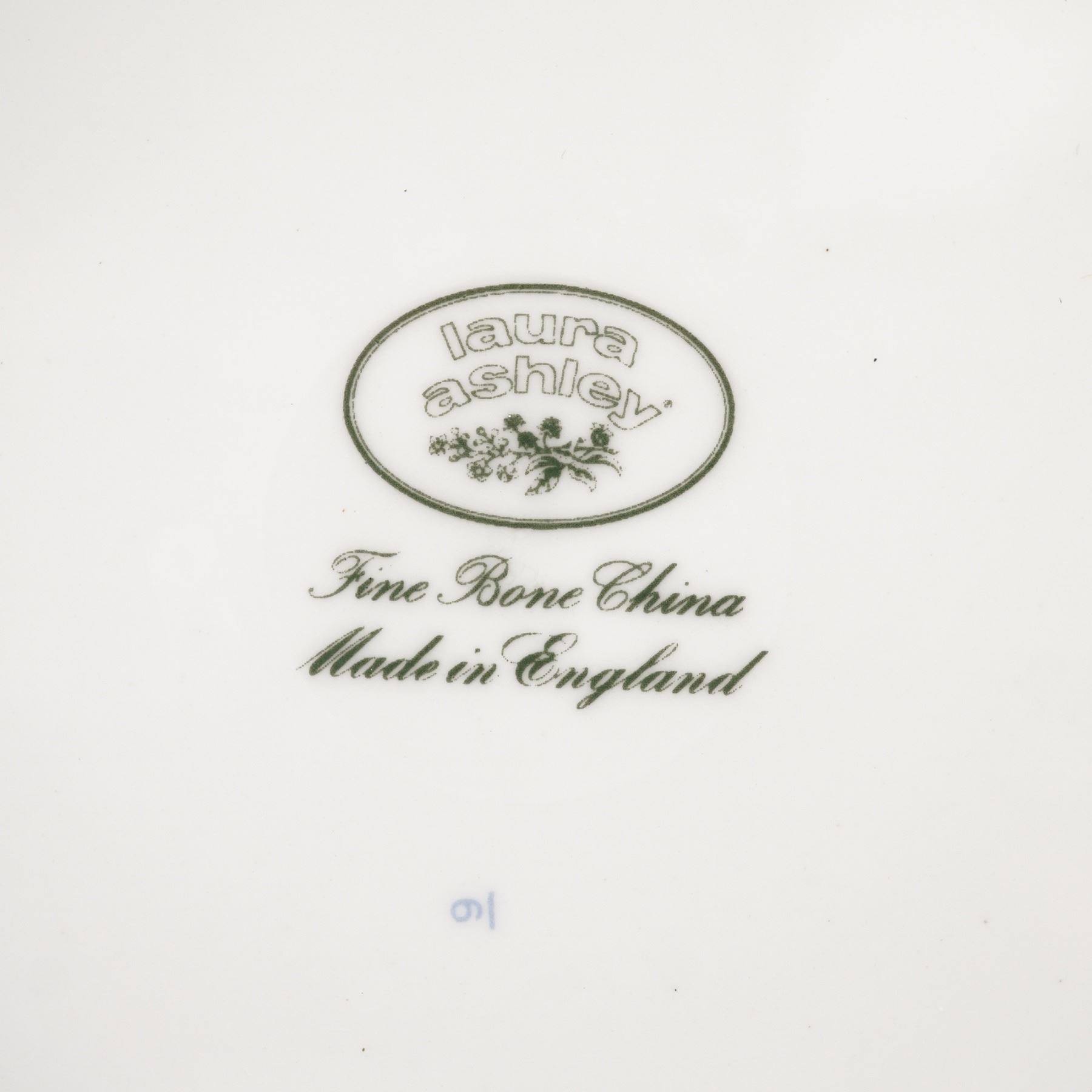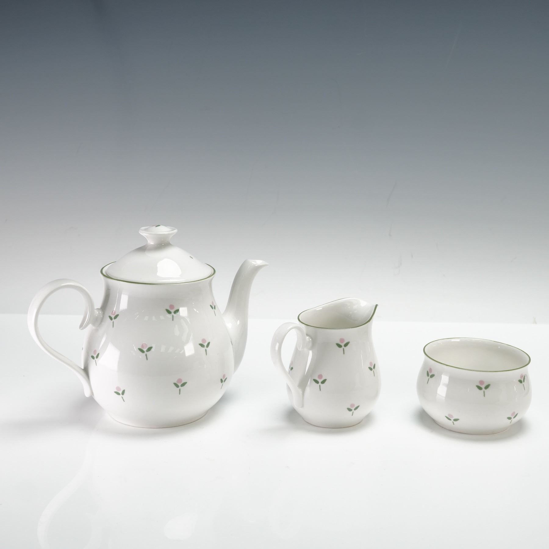 Laura Ashley Fine Bone China tea set for two made in England, decorated with a delicate green and pink floral sprig pattern and green rims, comprising teapot with lid, creamer, sugar bowl, two cups, two saucers, and two side plates, with original box.