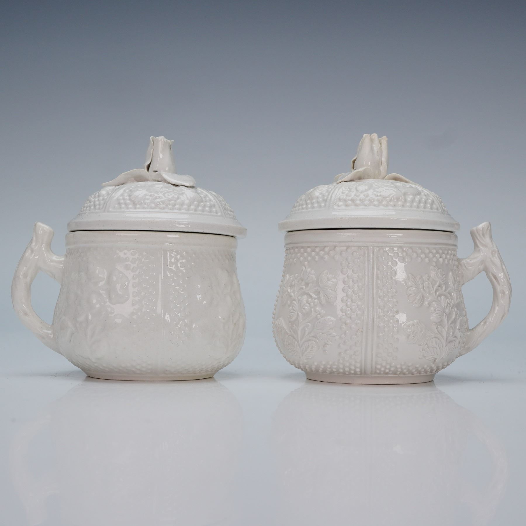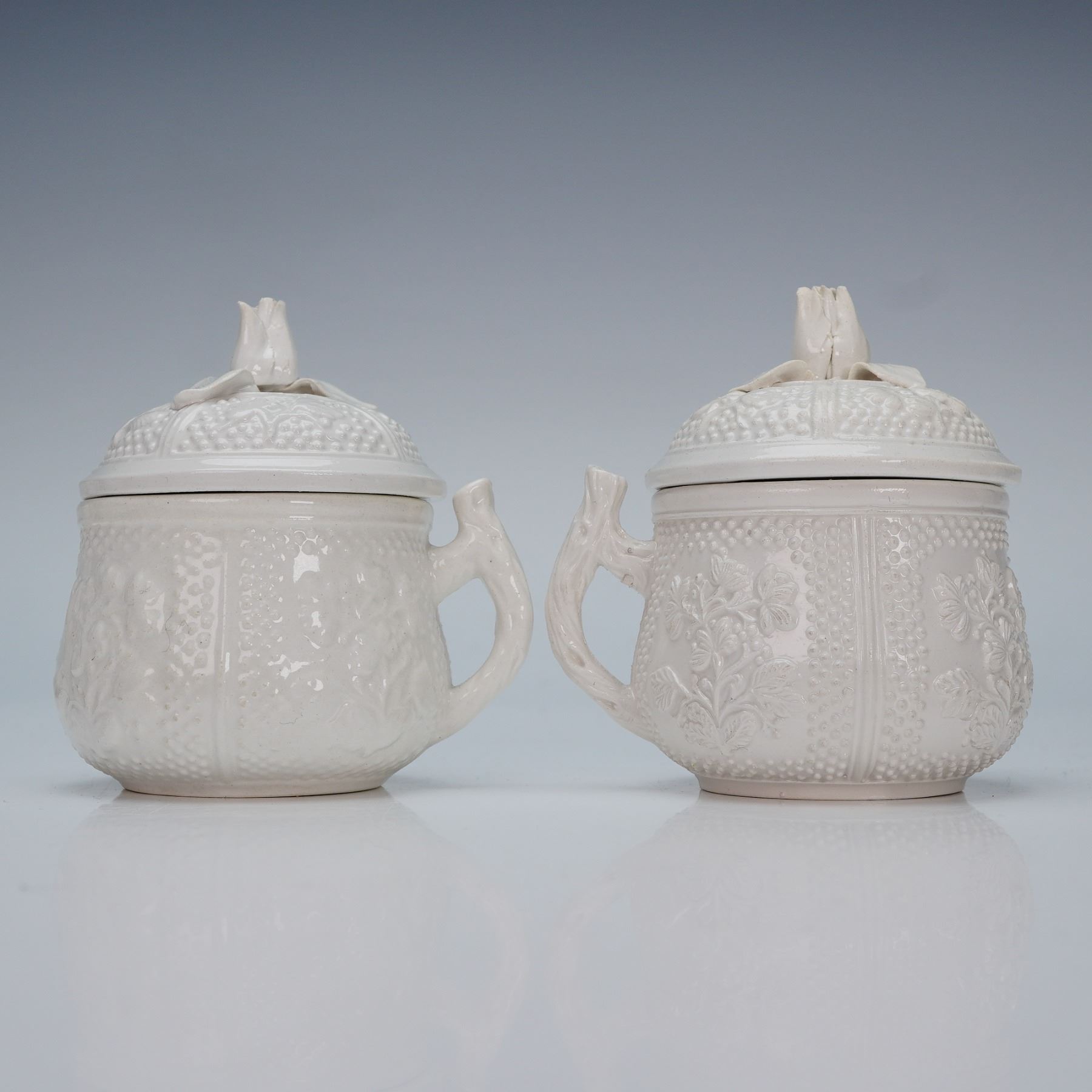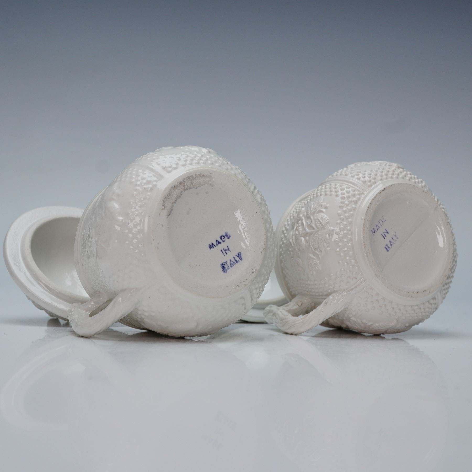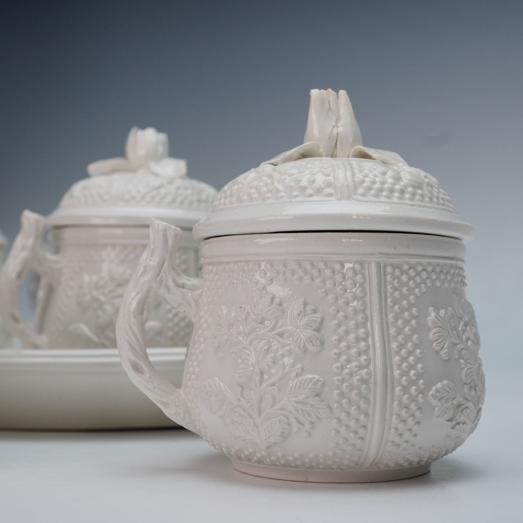 Set comprising eight lidded dessert cups and a matching tray. The pieces are reproductions of 18th-century Pont aux Choux factory designs, originally created in France during the late reign of Louis XVI for the production of delicate creamware and soft paste ceramics. Each cup is crafted from pottery with intricate relief floral and foliate patterns, and the lids are topped with a finely modeled rosebud and leaf finial. Each piece is ink-stamped MADE IN ITALY.