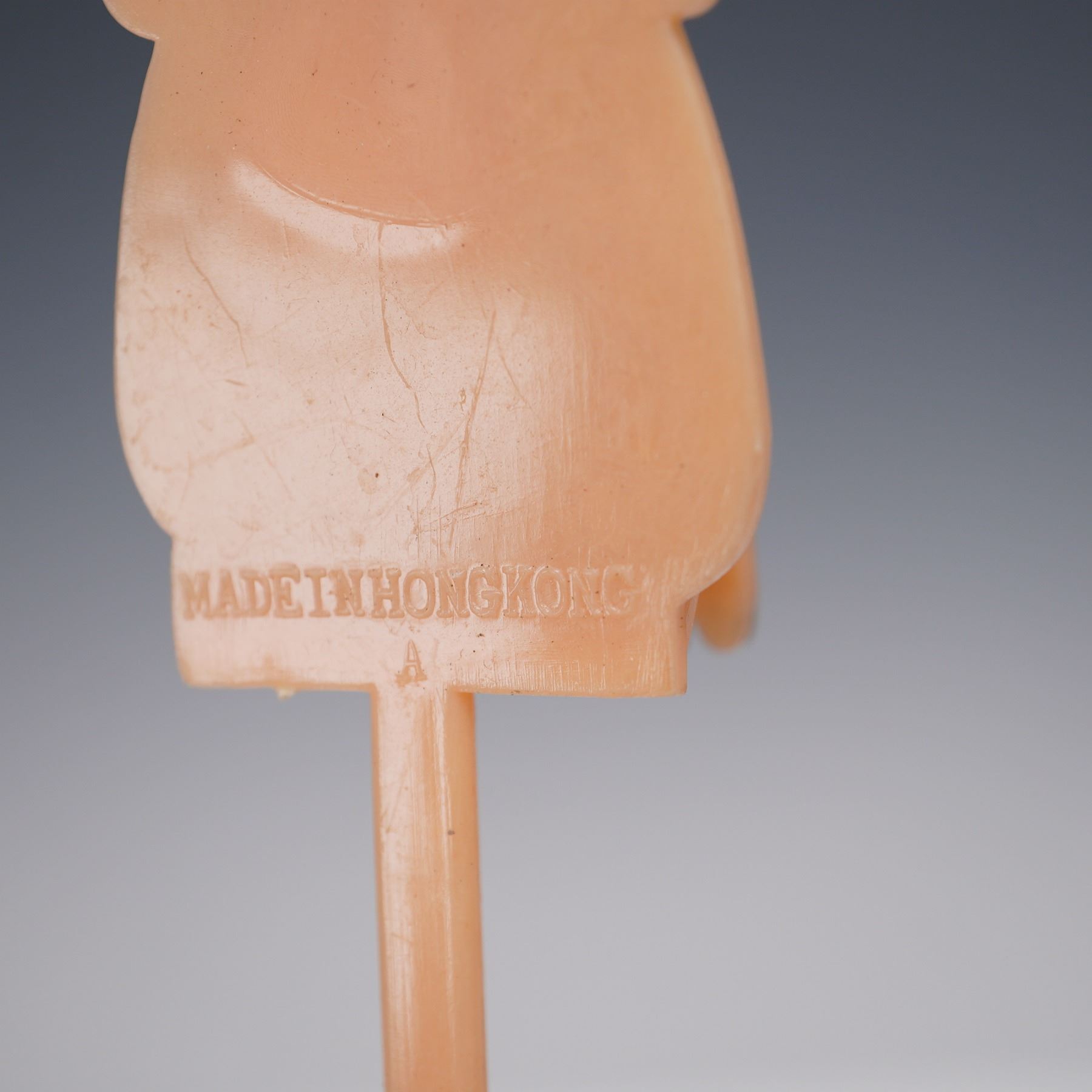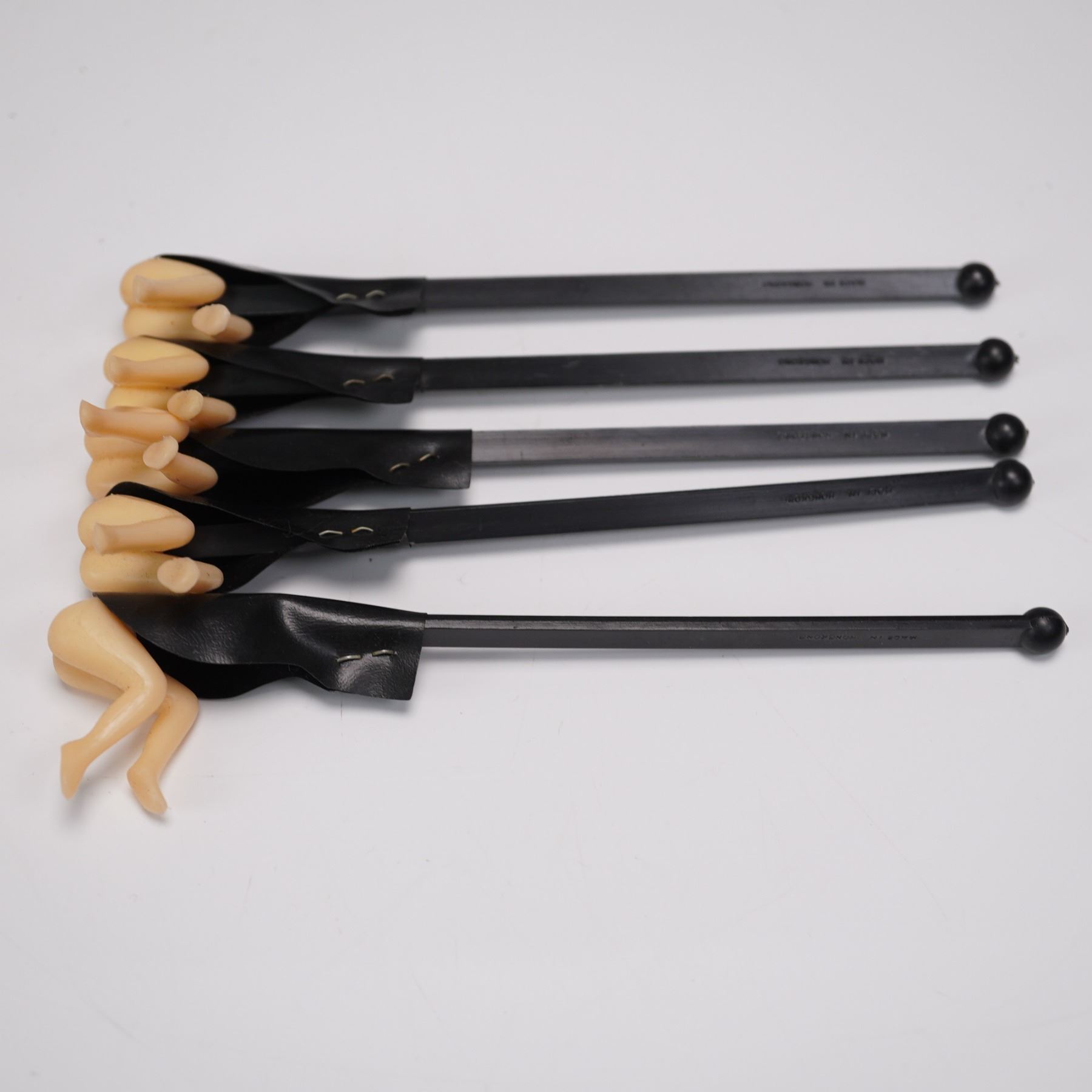 A humorous vintage collection of nine plastic novelty swizzle sticks made in Hong Kong, dating to the mid-to-late 20th century. The group includes five black cocktail stirrers modeled as women's legs extending from stylized skirts, and four pale peach-colored stirrers shaped like cartoonish decapitated heads with red heart-shaped noses and X-marks for eyes. All are molded in two-tone plastic and clearly marked Made in Hong Kong. These quirky midcentury bar accessories make a fun conversation piece for any tiki bar or retro entertaining setup.