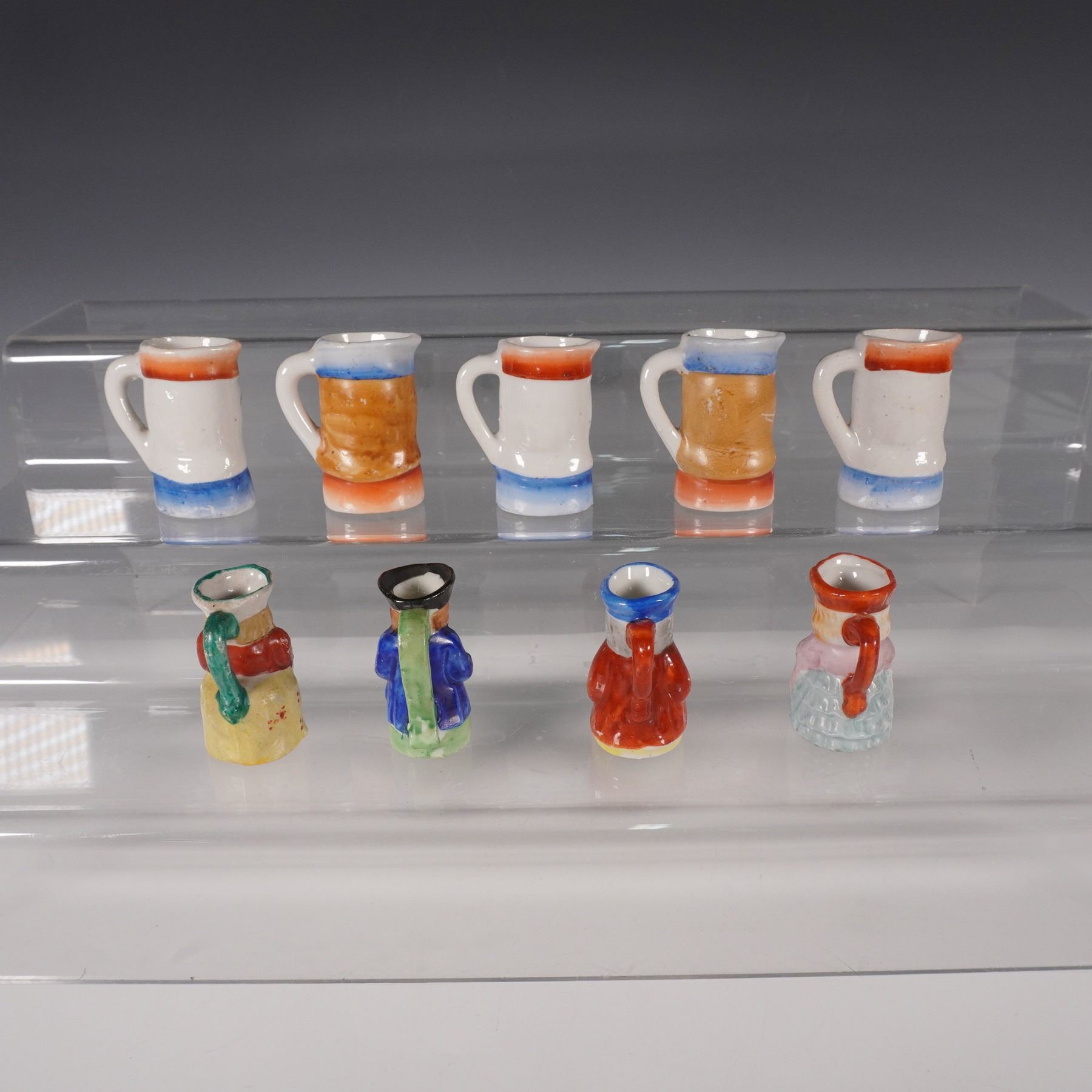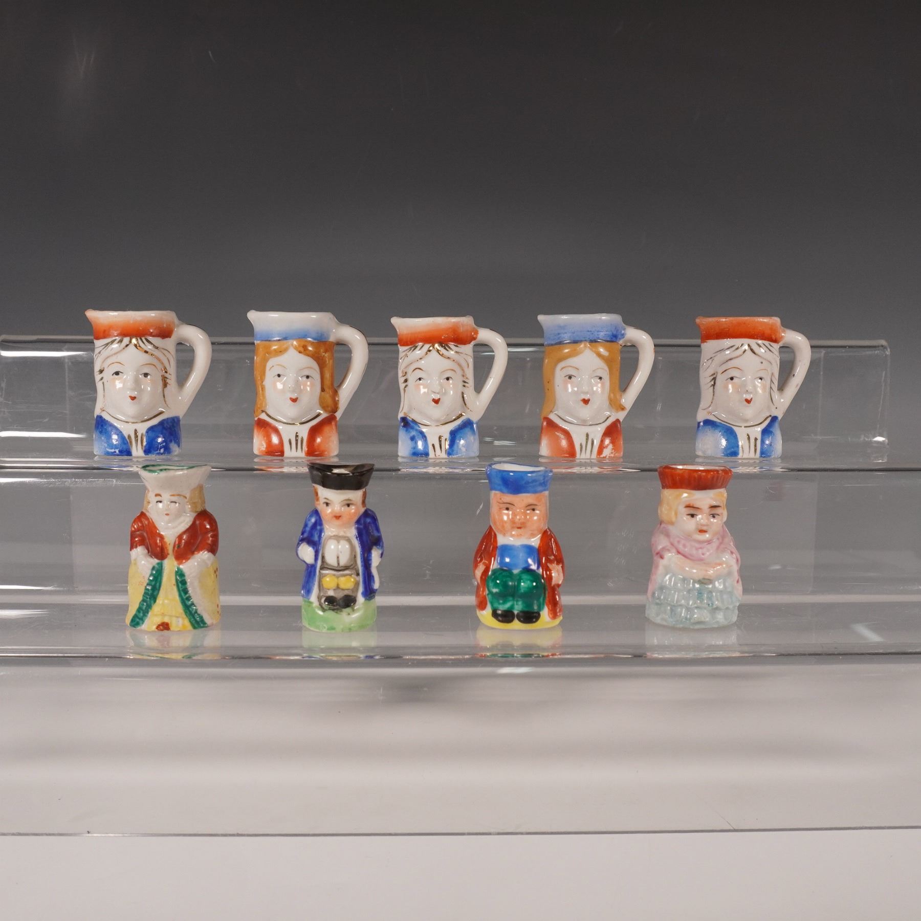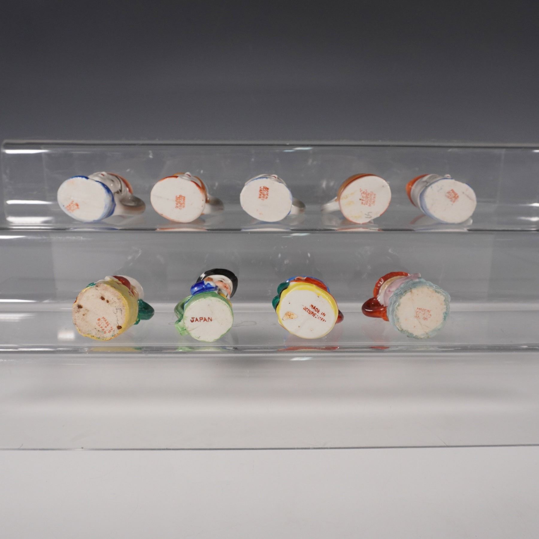 Set of 9 vintage miniature porcelain Toby and character jugs marked Made in Occupied Japan. Each piece is carefully hand-painted, depicting charming traditional characters with vibrant colors. The collection features miniature Toby jug-style figures along with whimsical seated and standing characters, exhibiting playful detailing and expressive facial features. These figurines, originating from Japan, showcase mid-century collectible appeal. Largest item measures 2.25"H.