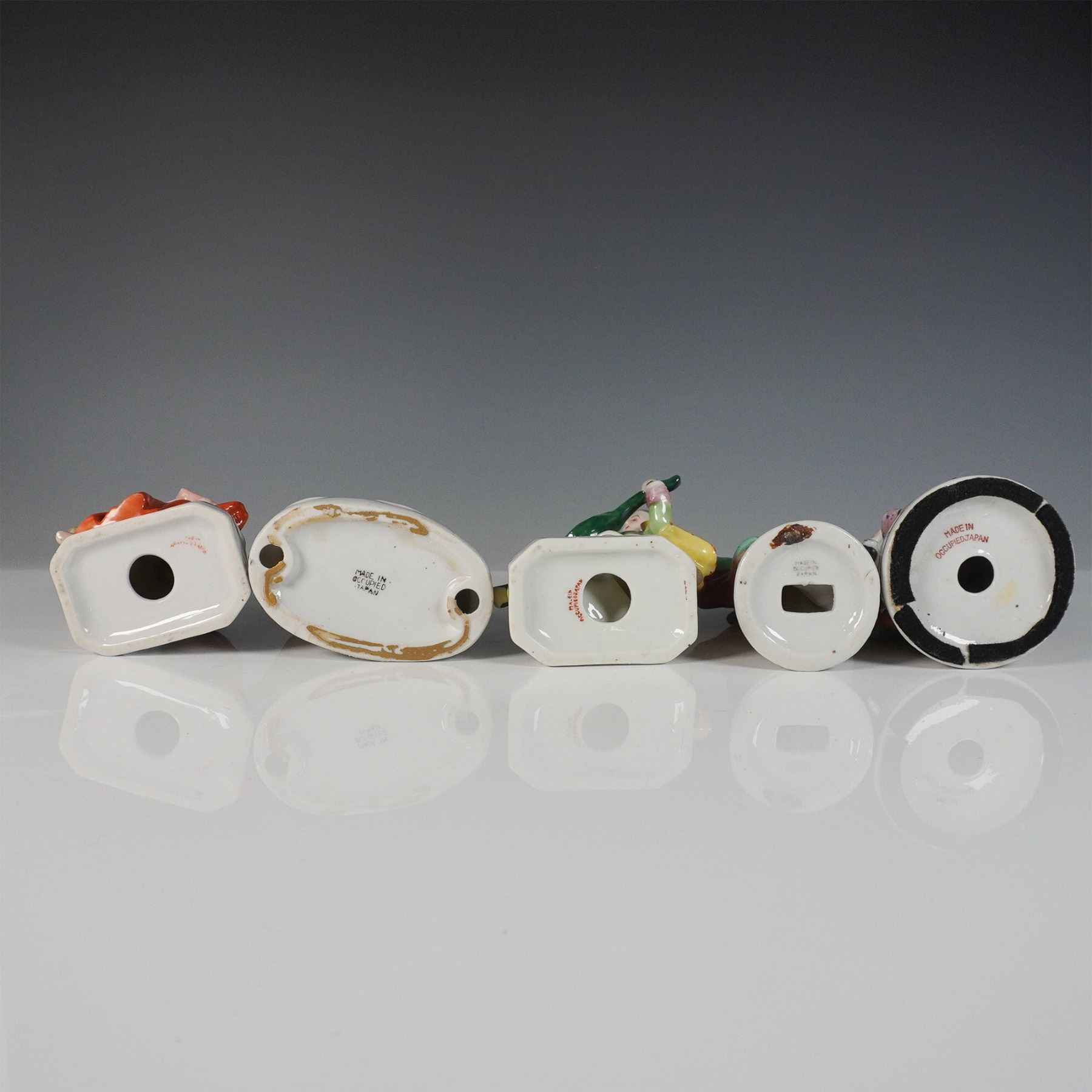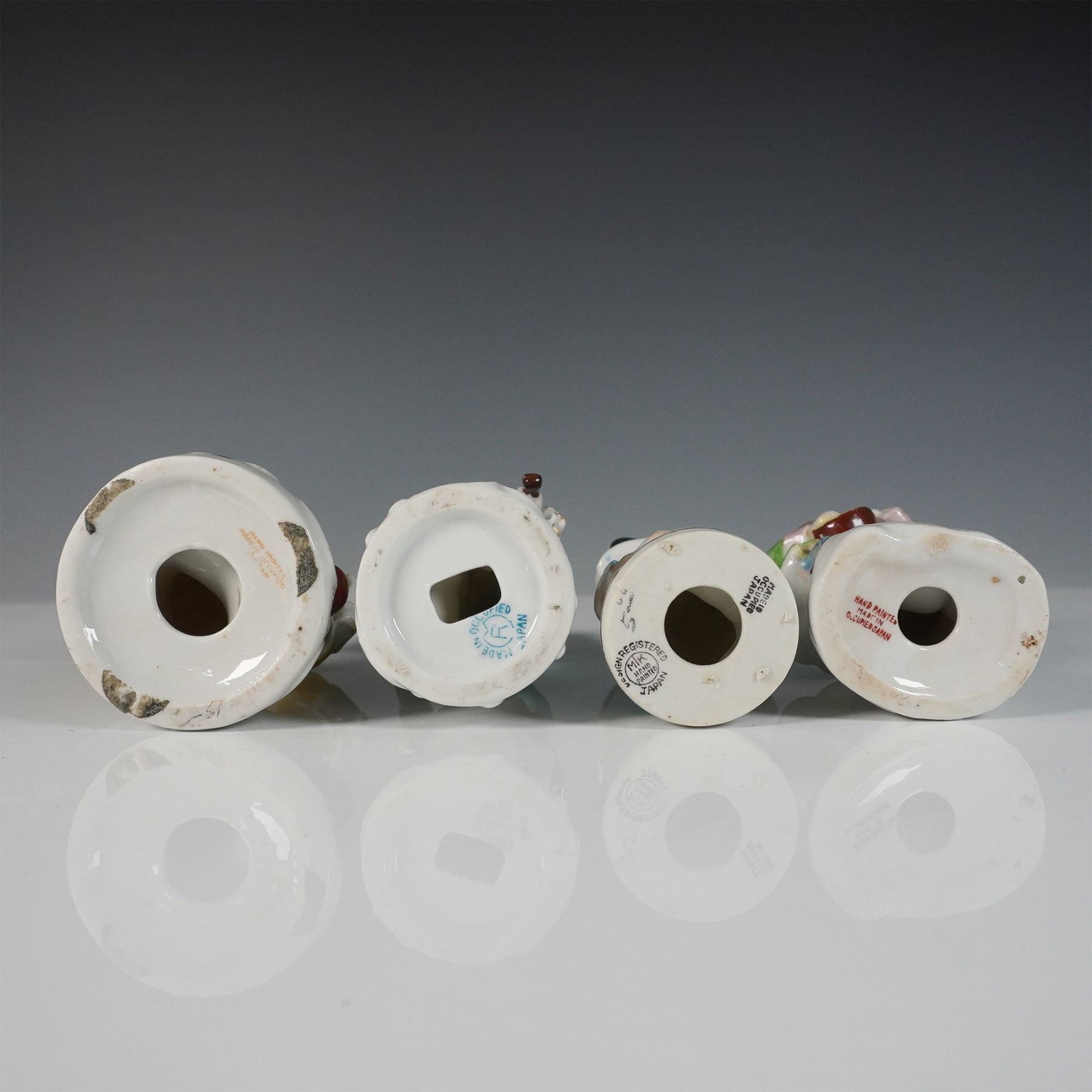 An impressive collection of nine hand-painted Occupied Japan porcelain figurines (1945-1952), depicting a variety of elegantly dressed figures and musicians in vibrant attire. Each figurine showcases intricate detailing and colorful hand-painted finishes. Marked "Made in Occupied Japan" on their bases, these figures offer historical significance and collectible appeal, making them an excellent grouping for collectors of vintage porcelain or mid-century memorabilia. Largest item measures 6"H.