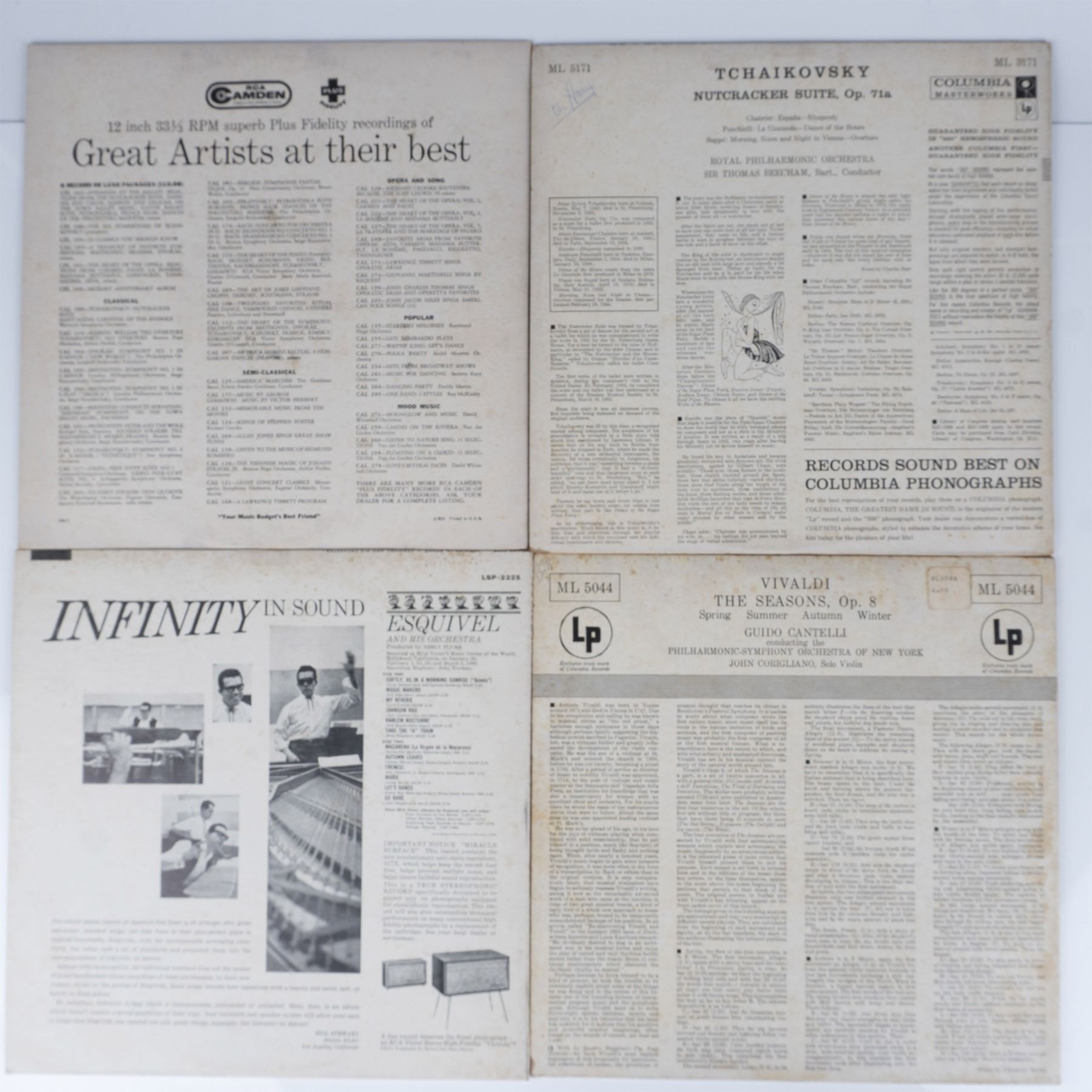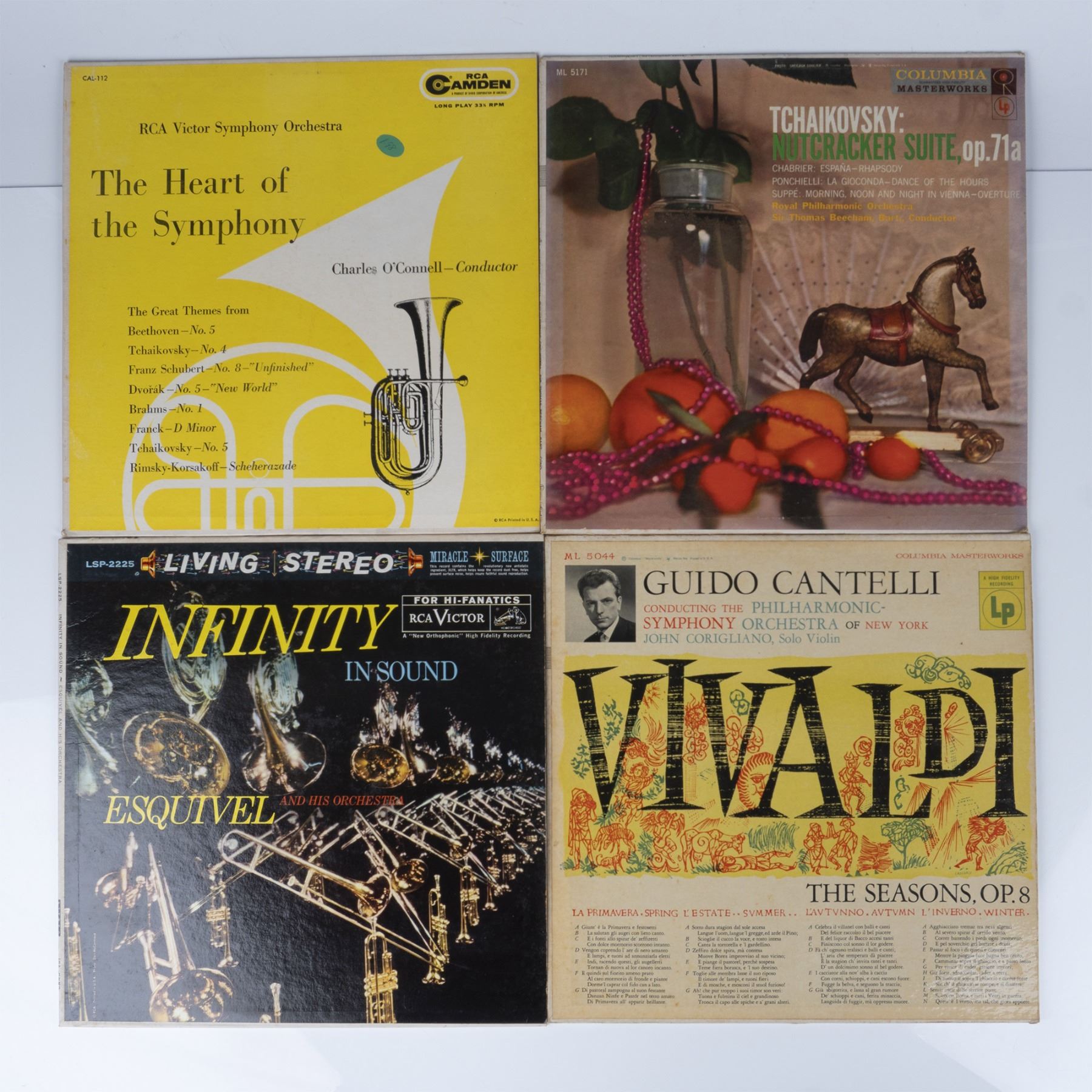 Great mix of orchestra based recordings as well as solo piano renditions of known music scores. Lot includes Polonaise Lorin Hollander; Provocative Piano; Don Shirley Piano Perspectives; Two Pianos & Twenty Voices; Infinity In Sound; Guido Cantelli Vivaldi; Tchaikovsky Nutcracker Suite; The Heart of the Symphony; and Festival of Light Classical Music 12 LP Box Set.
