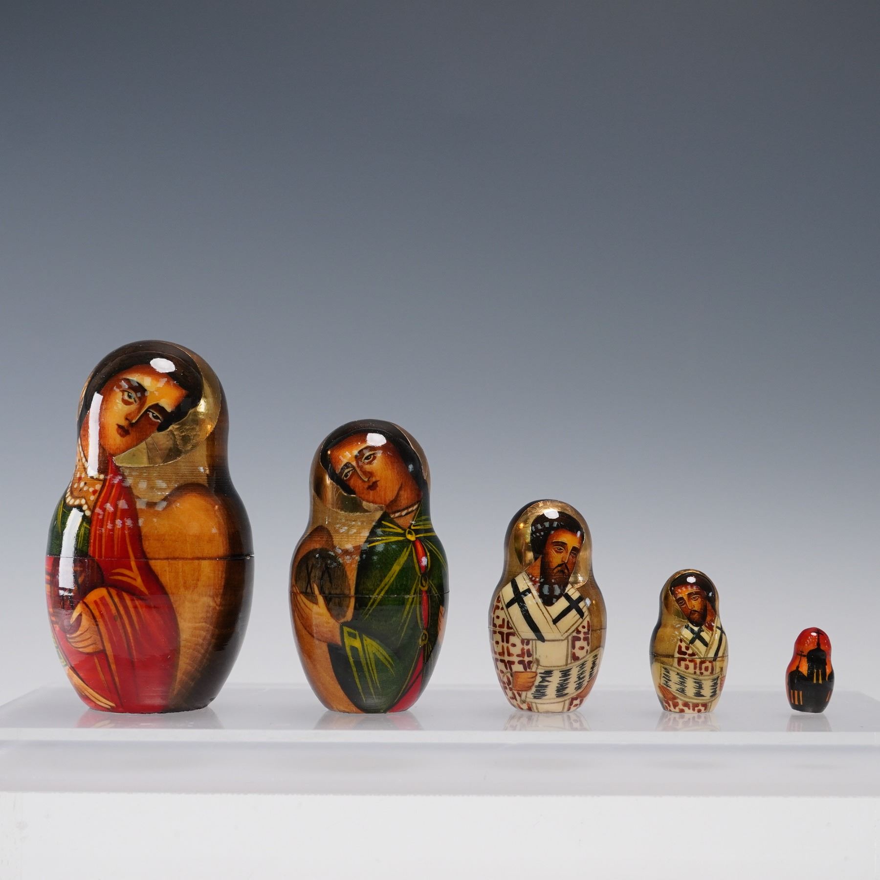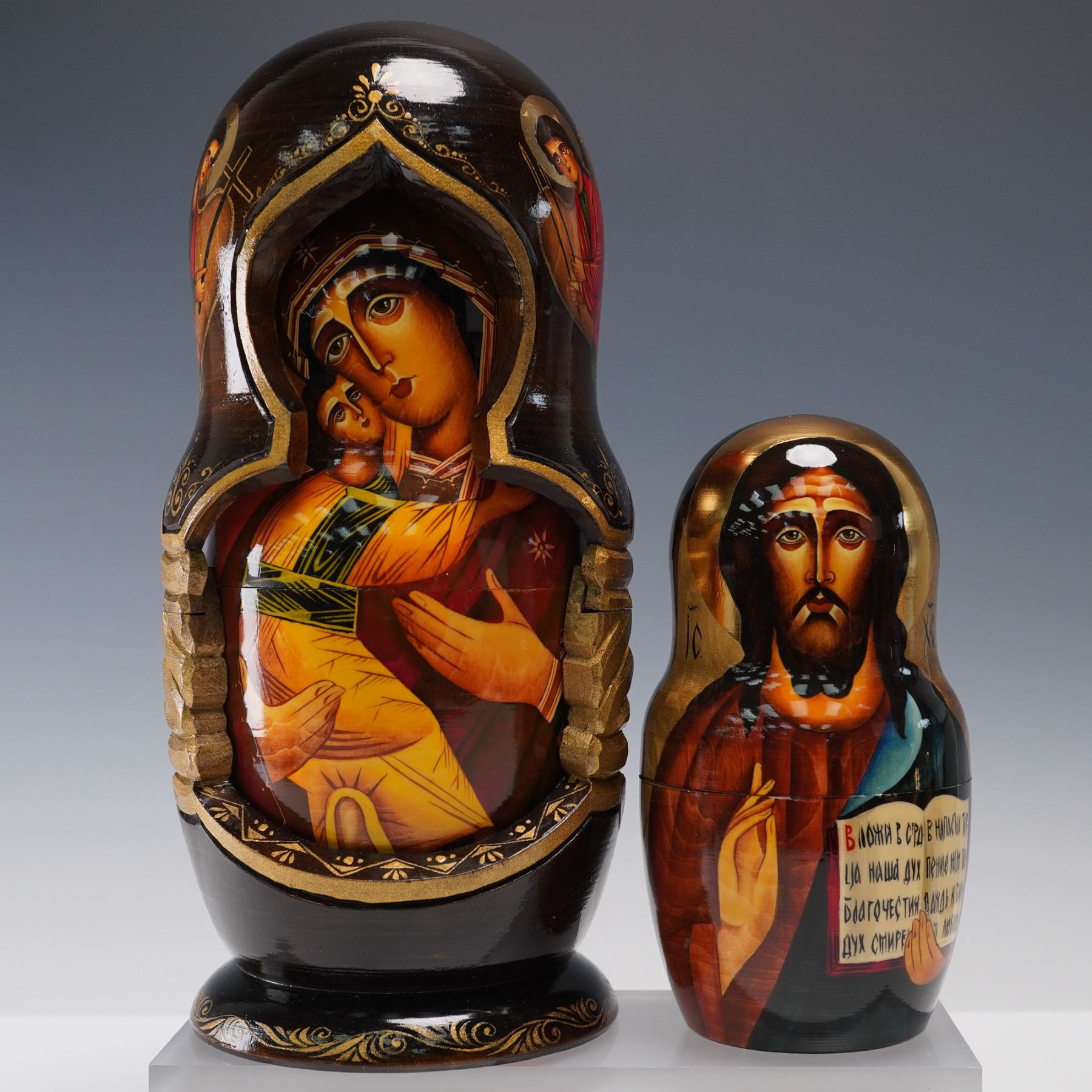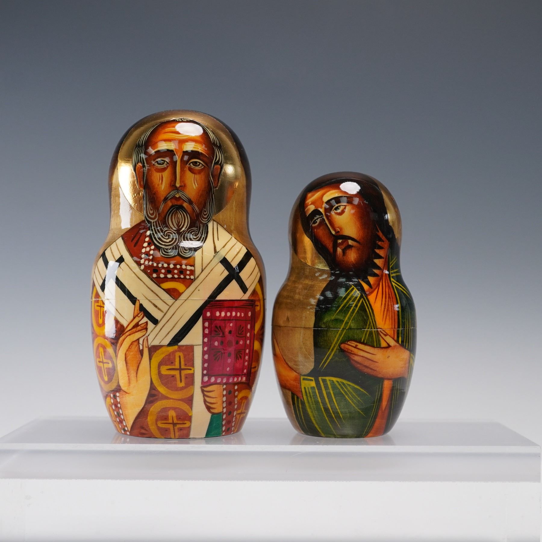 A Russian religious matryoshka nesting doll set featuring nine dolls, each hand-painted with intricate religious iconography. The set includes vibrant depictions of sacred figures, with the largest doll showcasing a detailed religious portrait. Crafted in the Sergiev Posad area, renowned for its long-standing tradition of producing finely crafted and painted nesting dolls, this set reflects the region's rich artistic heritage. The dolls are made of high-quality wood and finished with a smooth, glossy coating. The largest doll measures 10.25"H.