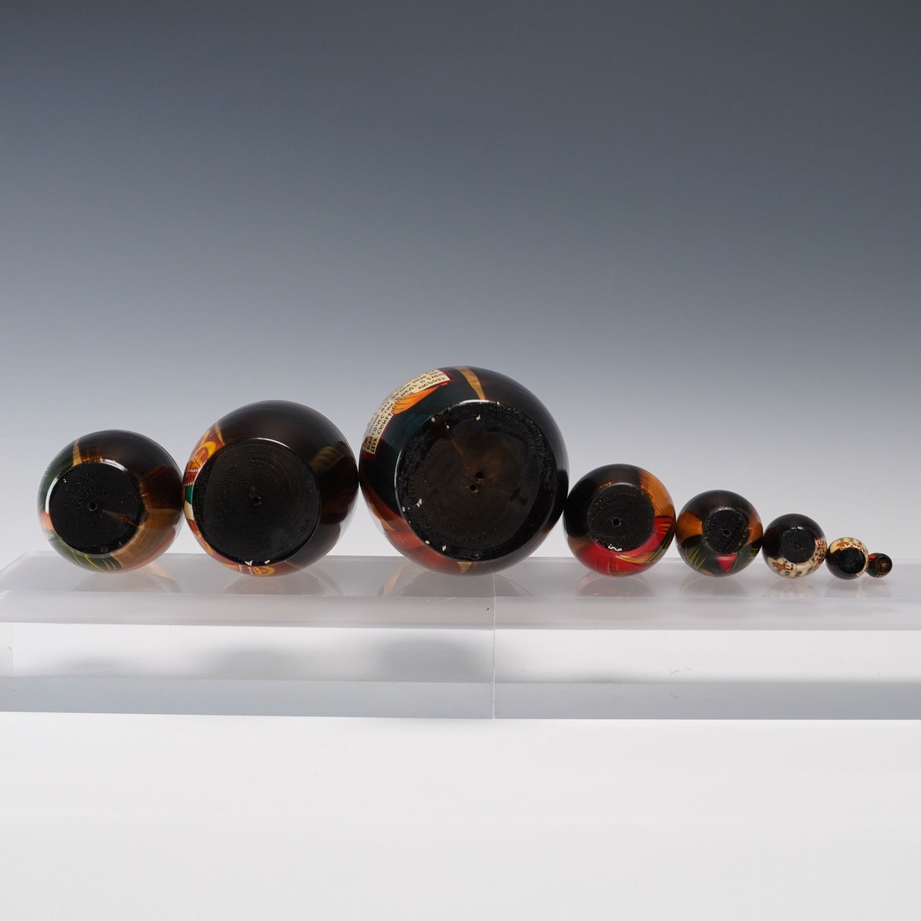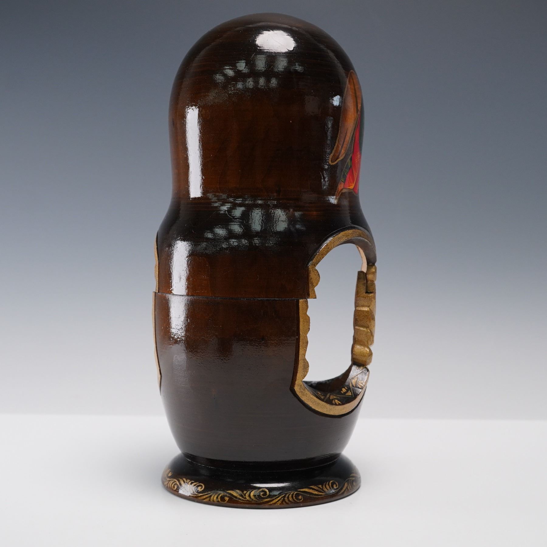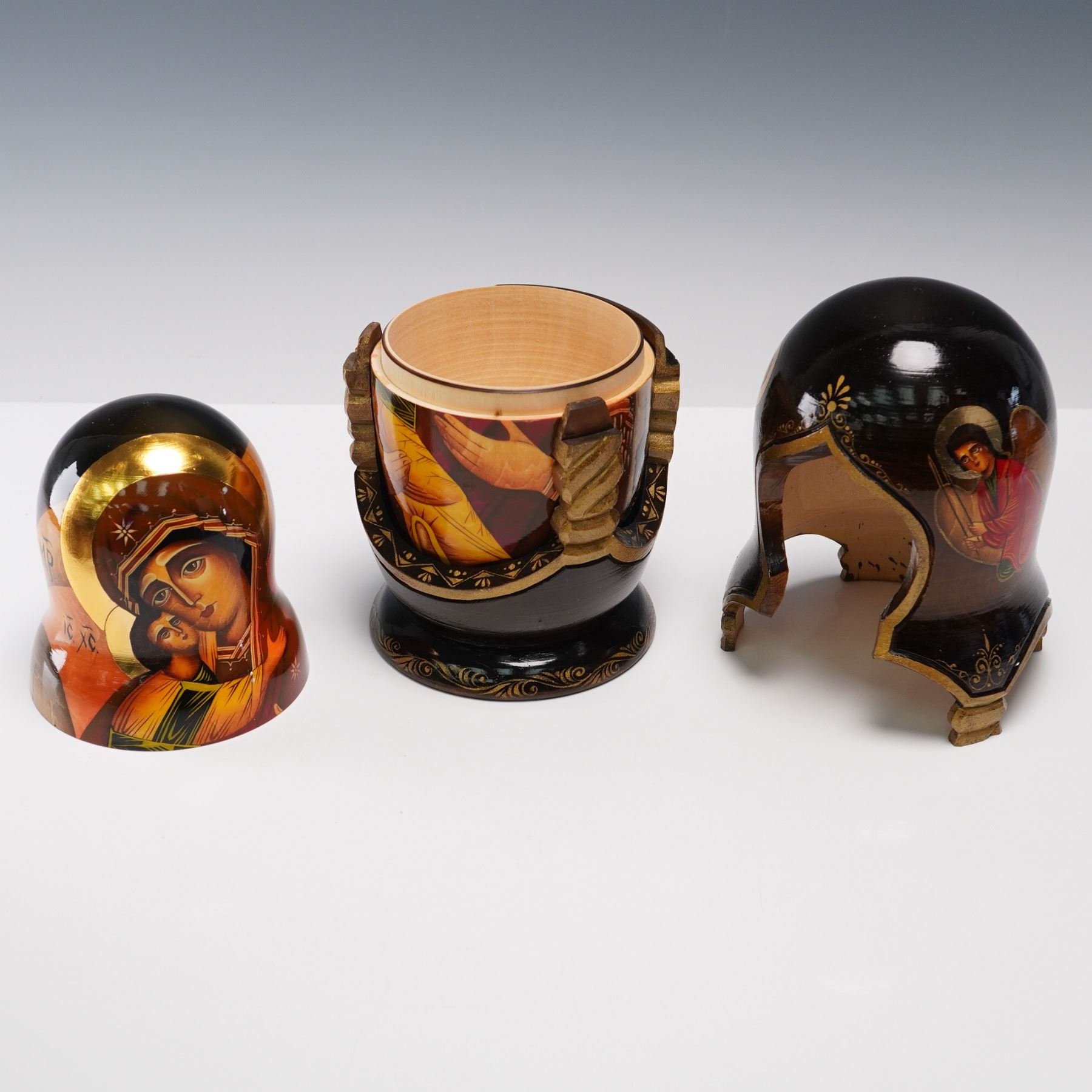 A Russian religious matryoshka nesting doll set featuring nine dolls, each hand-painted with intricate religious iconography. The set includes vibrant depictions of sacred figures, with the largest doll showcasing a detailed religious portrait. Crafted in the Sergiev Posad area, renowned for its long-standing tradition of producing finely crafted and painted nesting dolls, this set reflects the region's rich artistic heritage. The dolls are made of high-quality wood and finished with a smooth, glossy coating. The largest doll measures 10.25"H.