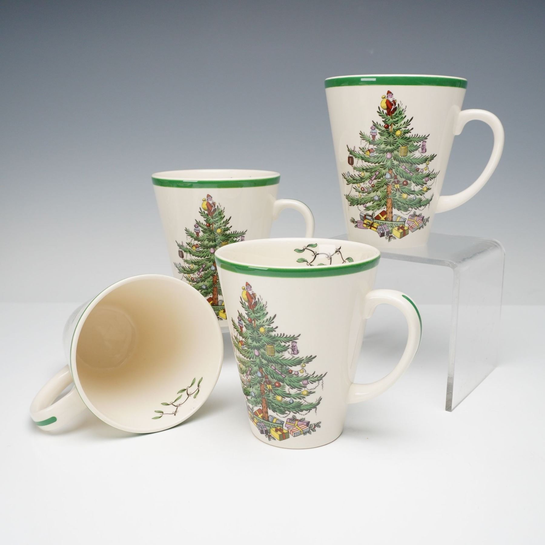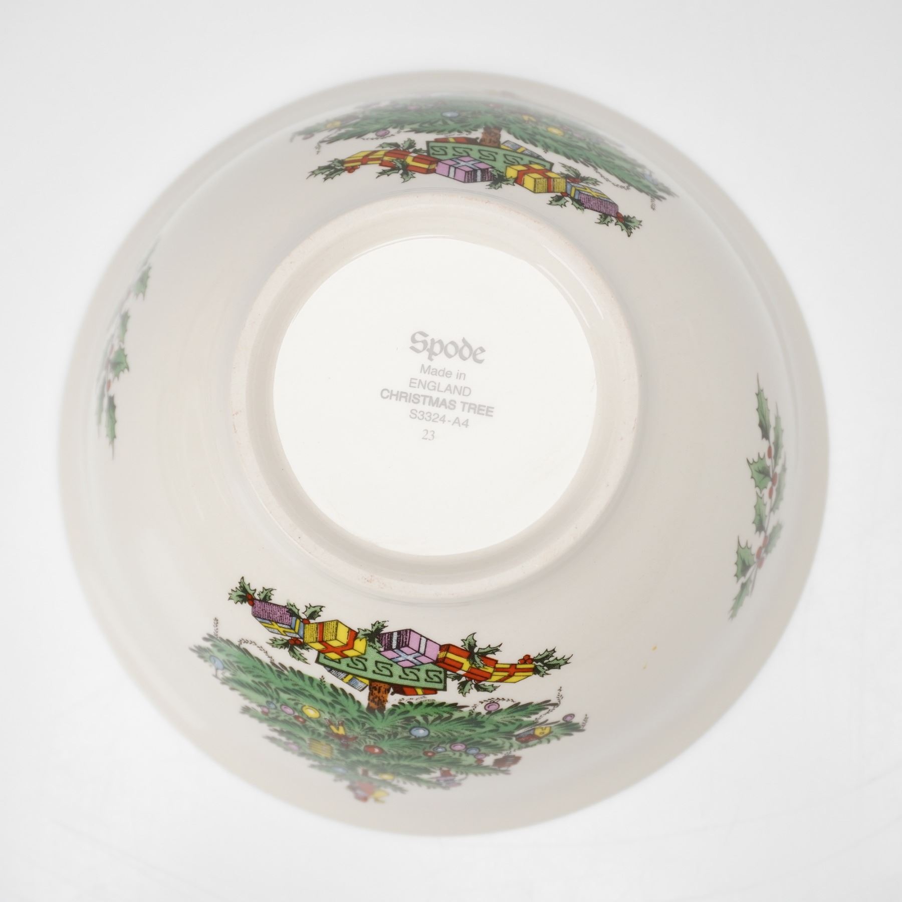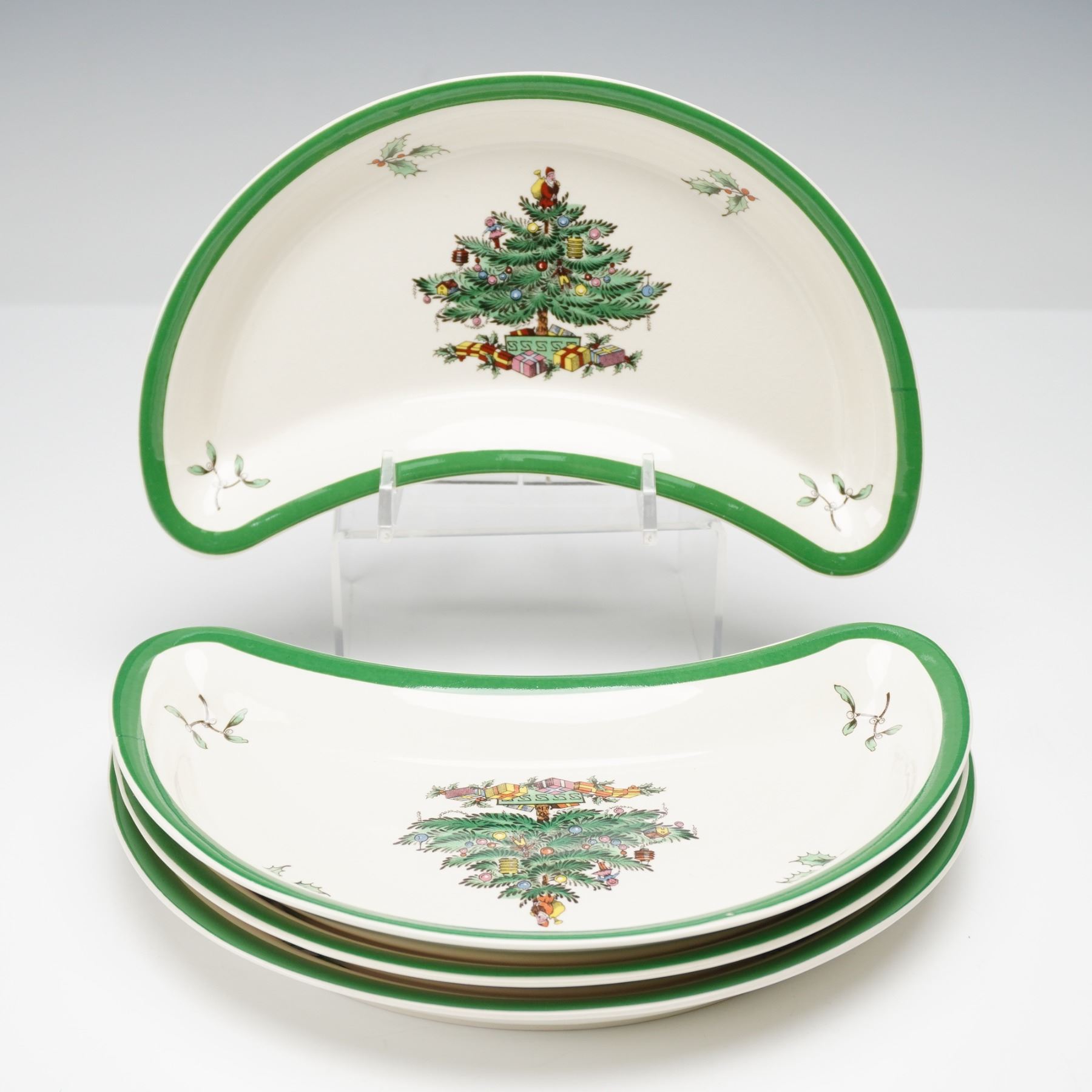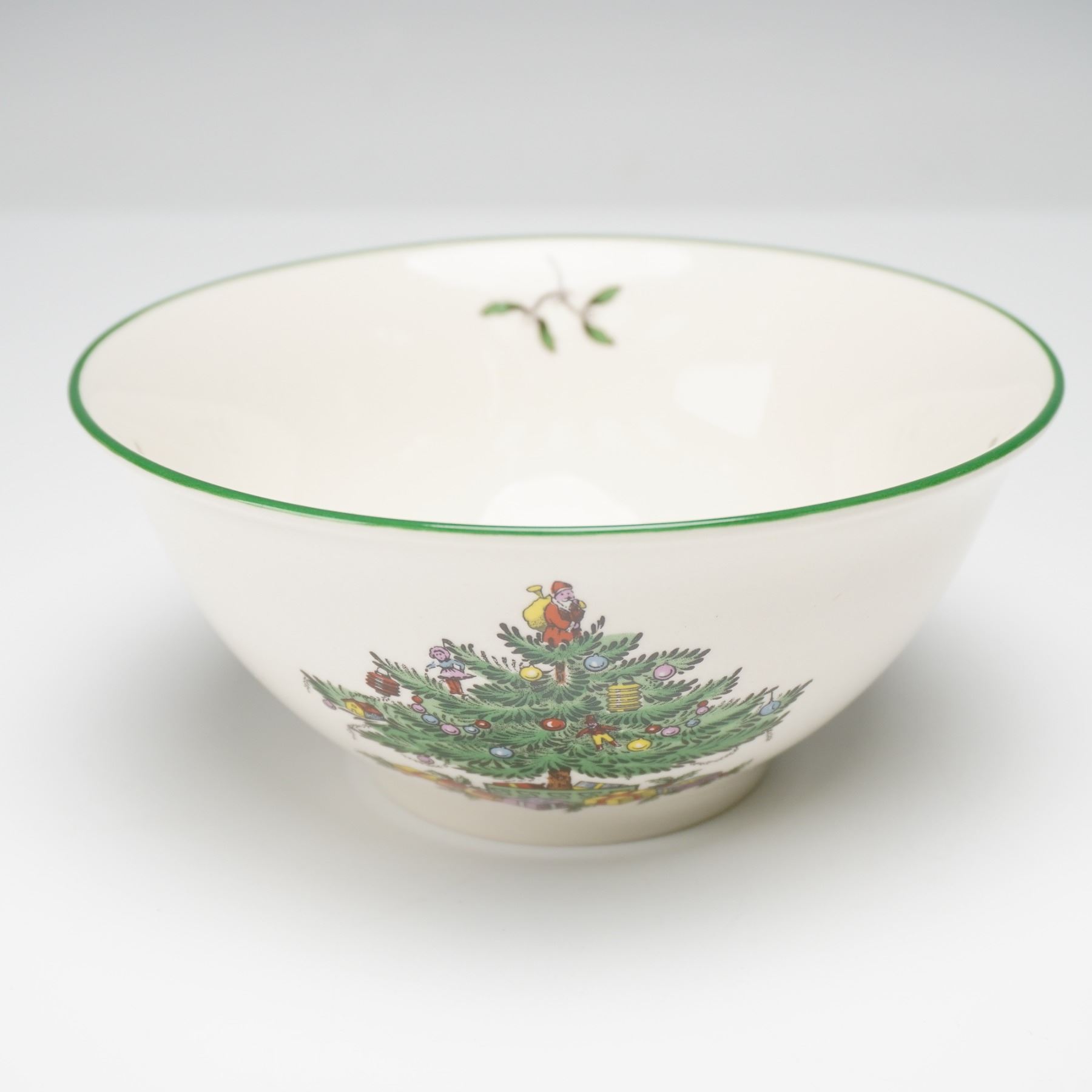 Festive 9-piece Christmas Tree porcelain dessert set by Spode, made in England. The set includes one small serving bowl, four coffee mugs, and four crescent-shaped plates. Each piece features Spode's classic Christmas Tree pattern introduced in 1938, depicting a beautifully decorated evergreen topped with a Santa figure carrying a gift bag, surrounded by holly and mistletoe sprigs along the rim. Finished with Spode's signature green banding, this timeless holiday design has become a beloved seasonal tradition for generations. Perfect for serving desserts, coffee, or holiday treats.