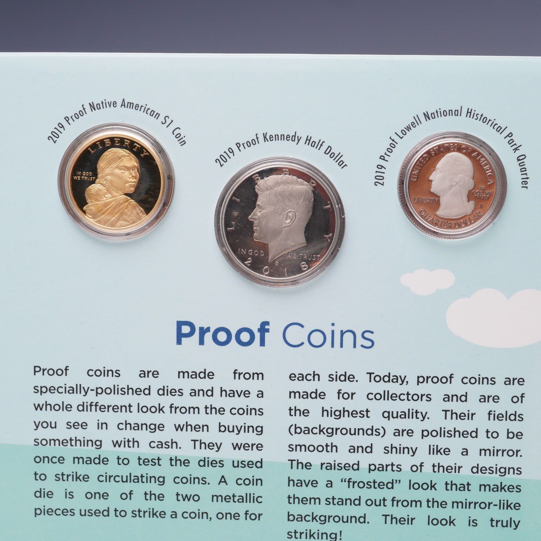 Mixed 9pc United States coin collection featuring various educational and commemorative sets. Includes the 1998 Uncirculated Coin Set in original mint packaging, the 2018 American Innovation $1 Proof Coin, and the 2019 Explore and Discover Coin Set containing both uncirculated and proof coins. Also included are the Lewis and Clark Bicentennial Set, the 2021 Thomas Jefferson Nickel Collection featuring P, D, and S mint marks. The lot is completed by four additional sealed coin packs. Largest display measures 6.25"L x 8"H.