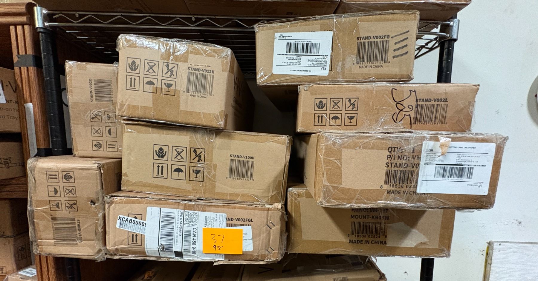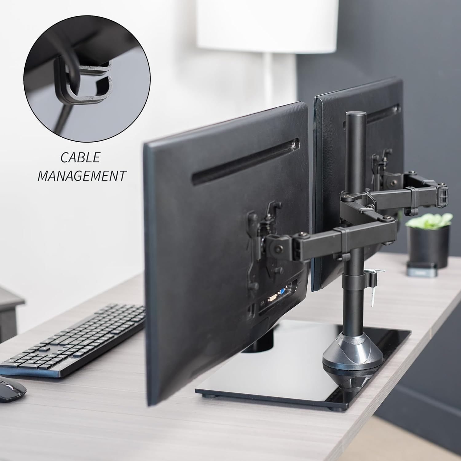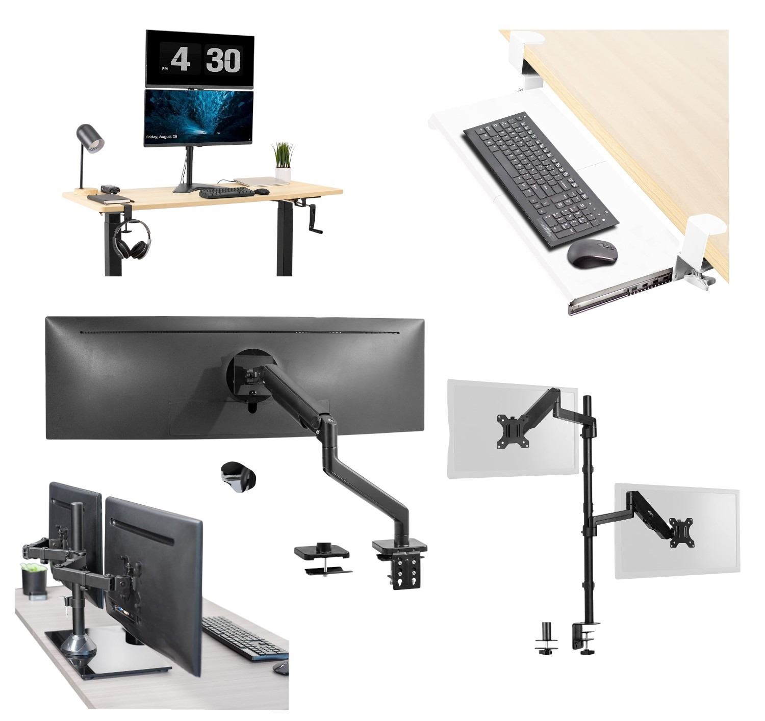 9pc assorted VIVO monitor mounts & items - pneumatic arm dual extra tall, mechanical arm, dual monitor desk stands, white clamp-on keyboard tray etc. (refurbished in boxes)