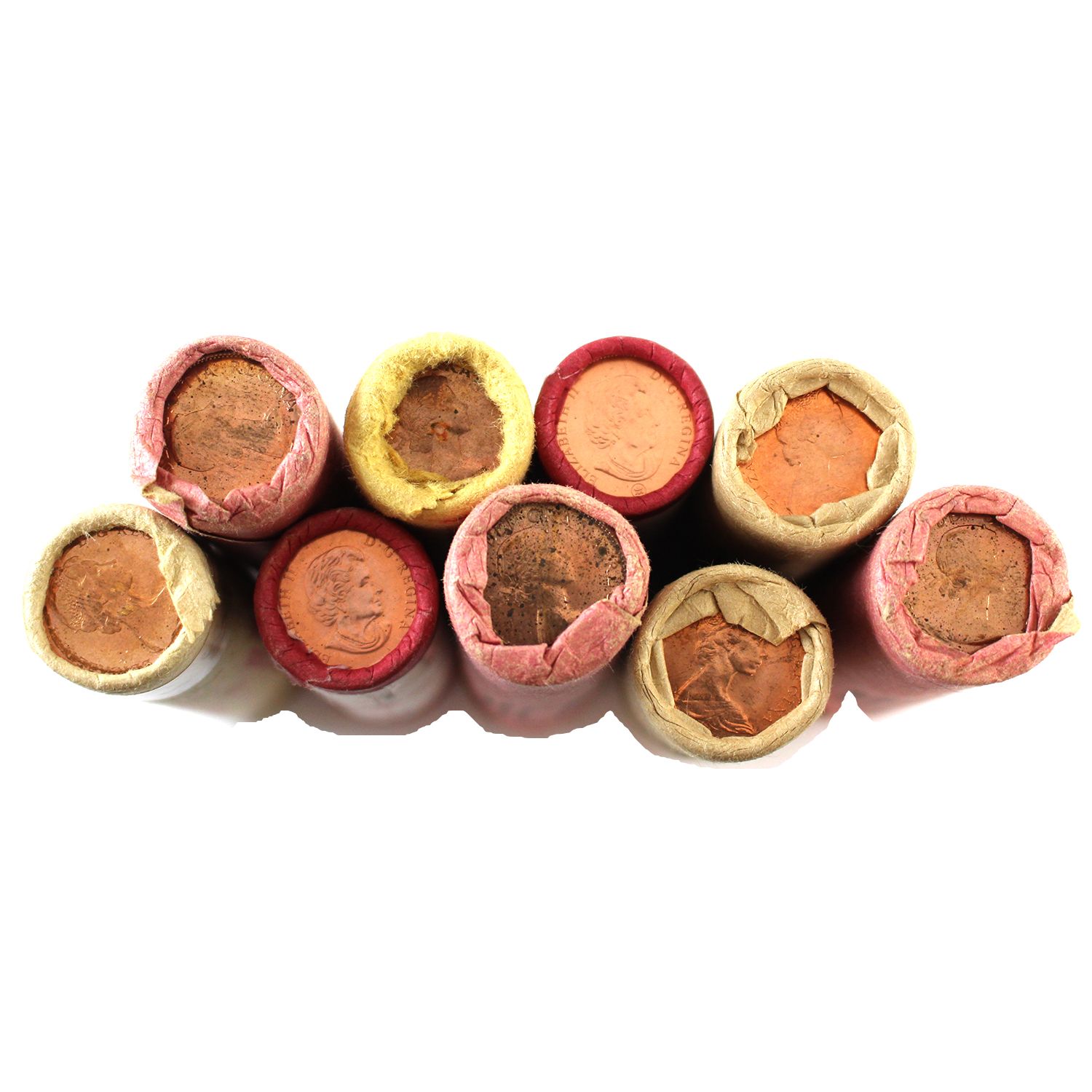 9x 1-cent Canada Double Head Rolls of 50pcs. The dates of these rolls are unknown, wrap appears to be from the 1960's and up.