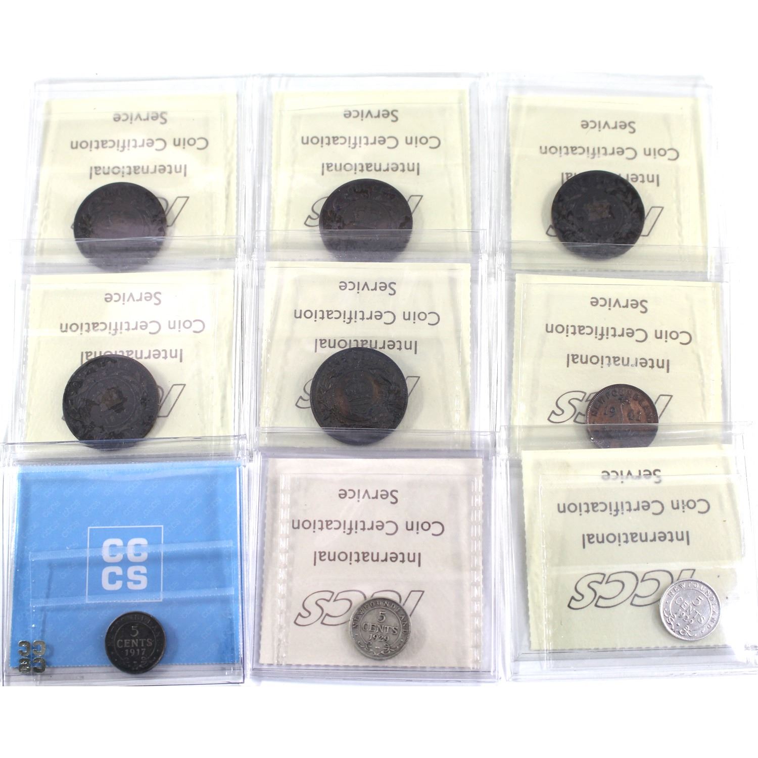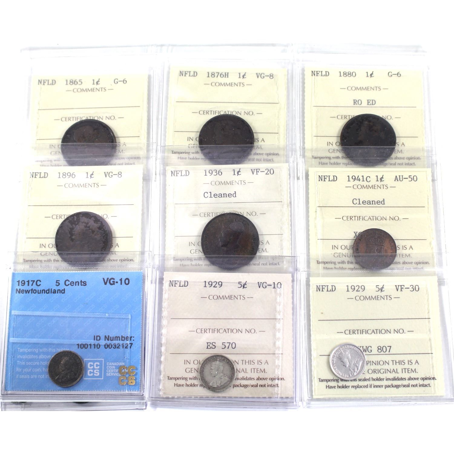 9x 1865-1929 NFLD 1-cent & 5-cent ICCS Certified. Lot includes: 1865 1c G-6, 1876H 1c VG-8, 1880 ROED 1c G-6, 1896 1c VG-8, 1936 1c VF-20 (Cleaned), 1941C 1c AU-50 (cleaned), 1917C 5c VG-10, 1929 5c VG-10 & 1929 5c VF-30. 9pcs