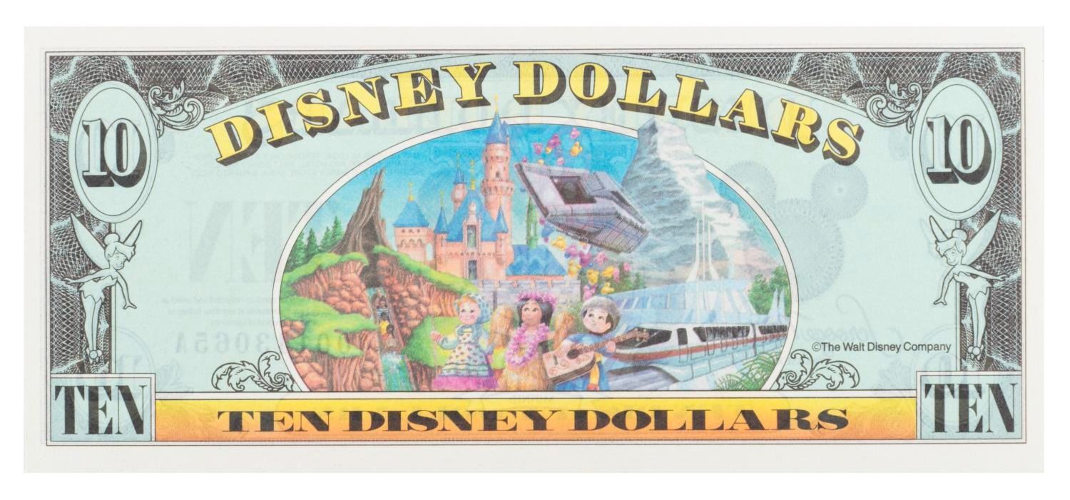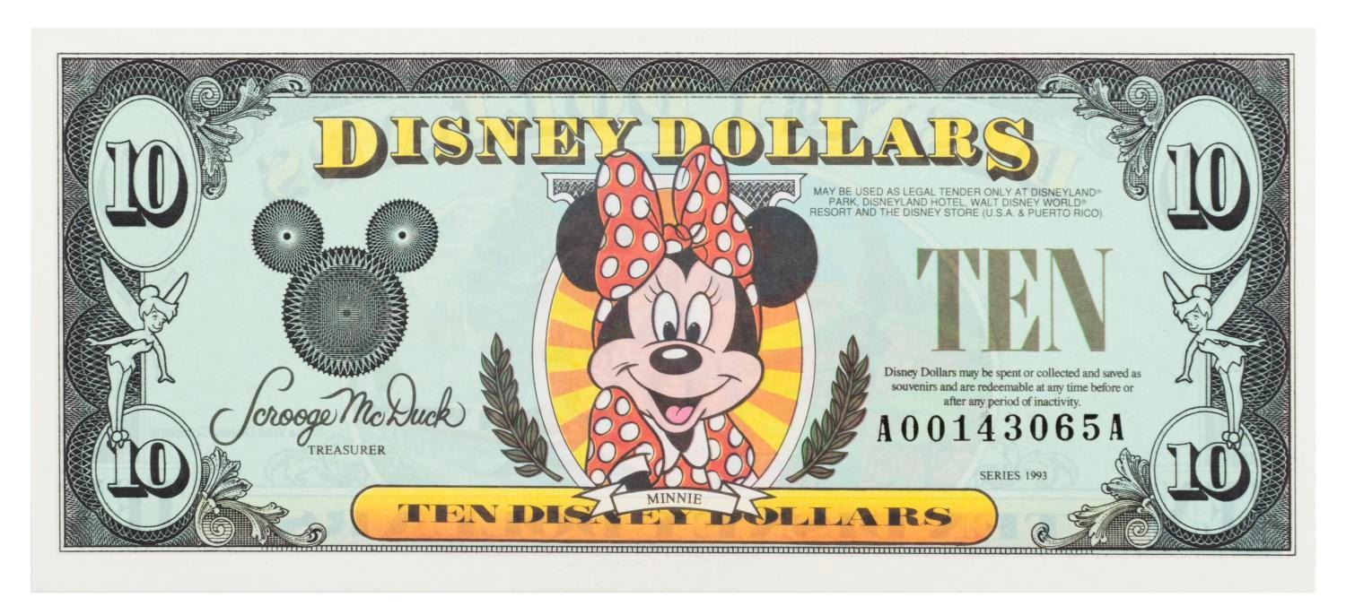 (Disney, 1993) A Disney Dollars Minnie $10 bill from Series 1993, numbered A00143065A. Measuring 2.75” x 6.25”, the bill is in fine condition.