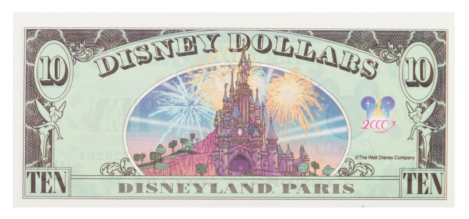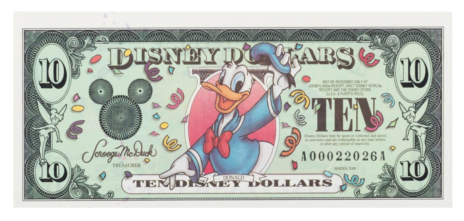 (Disney, 2000) A Donald Duck Disney Dollar $10 bill from Series 2000, numbered A00022026A. Measuring 2.75” x 6.25”, the bill is in fine condition.