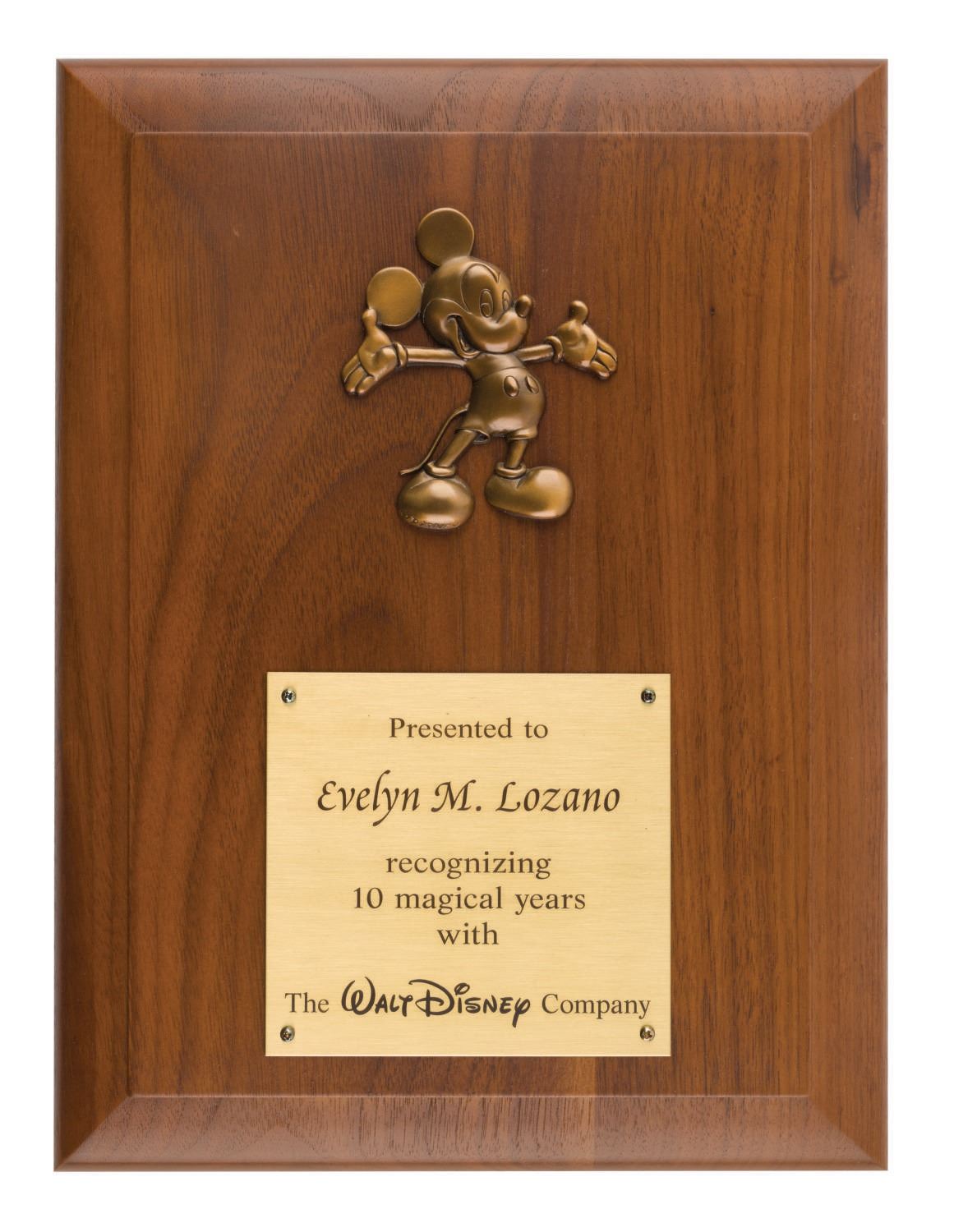 (Imagineering, 1990s) A 10-Year Walt Disney Company Service Award. The award was given to Walt Disney Imagineering Creative Coordinator Evelyn Lozano in recognition of her service to the company. Measuring 9"x12", the plaque is in fine condition.