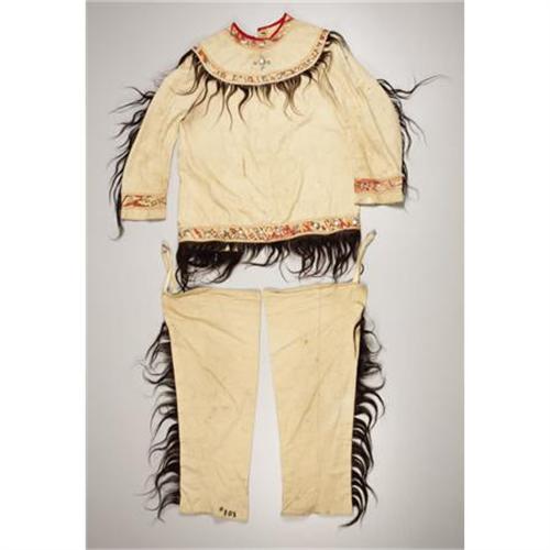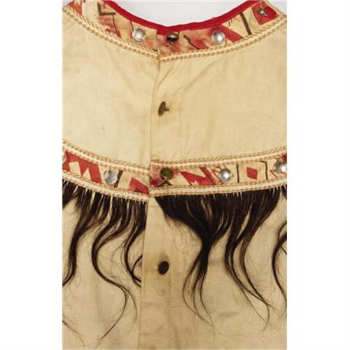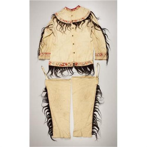 <B>A 101 RANCH ENSEMBLE<BR><BR></B></I>c. 1915 a shirt and leggings, composed of cotton cloth, decorated with printed cotton trim, small metal conchas, and hair locks<BR><BR>Lengths: shirt, 28 inches; leggings, 30 inches each <B>Condition Report:</B> Overall very good. Fabric with wear & soiling. Approx. 3 metal discs missing. Material edging with fraying, staining and loss. No apparent restoration.<BR><BR><b>Shipping:</b> Requires 3rd Party Shipping (<a target="_blank" href="http://www.heritageauctions.com/common/shipping.php">view shipping information</a>)