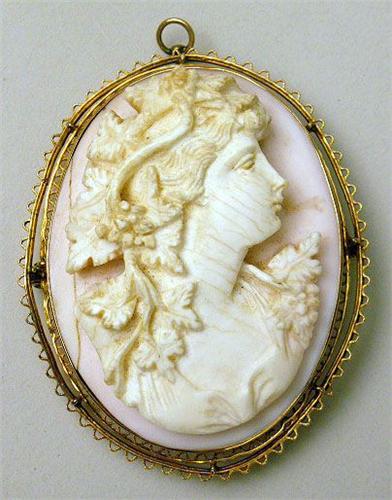 Pierced heart form links with central floral motif. 6"l. Together with a carved oval cameo of a young woman with grapes and leaves in her hair, set in gold filigree setting, cracked and repaired, a yellow and white gold riding crop brooch in Abercromb