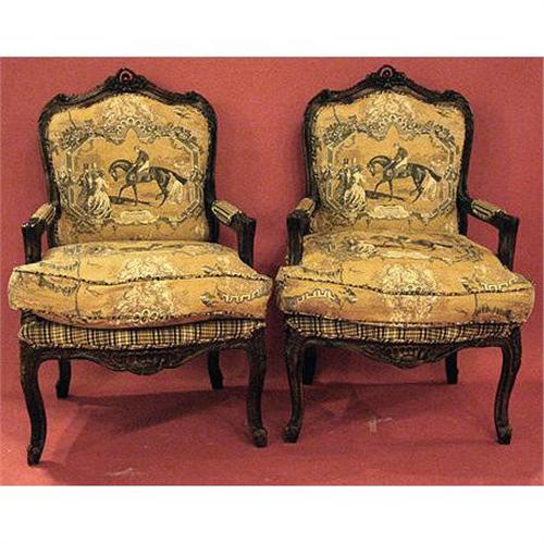 Beautiful Pair of Louis XV Style Arm Chairs Exquisite Walnut Carving Upholstered In Lovely Horse Print Fabric