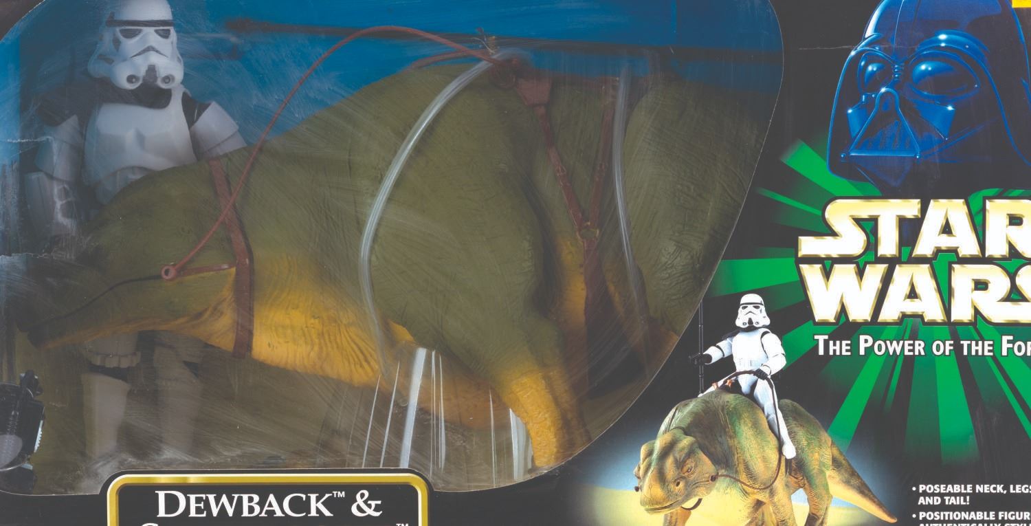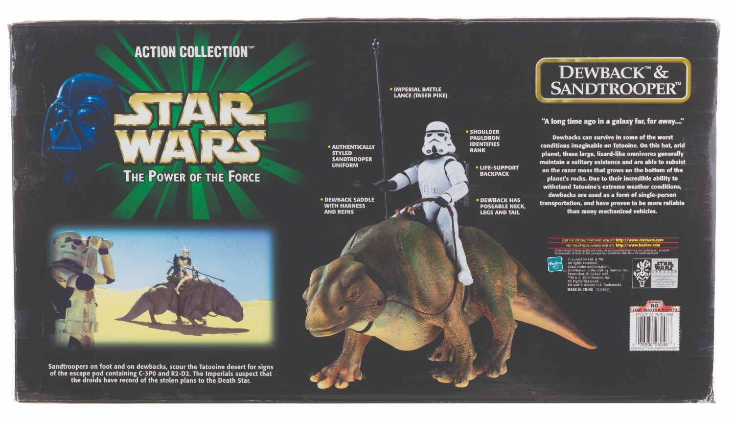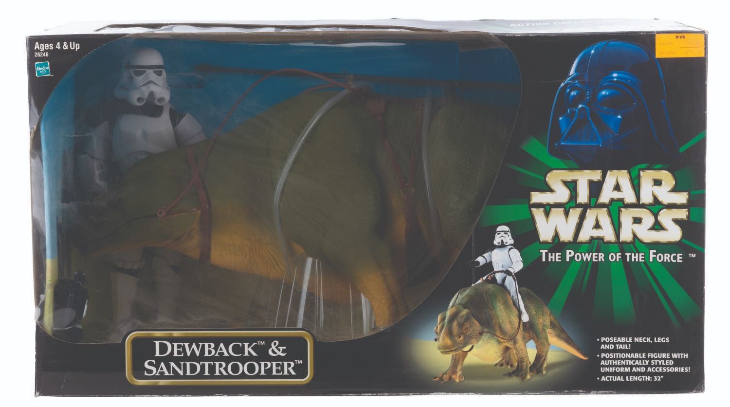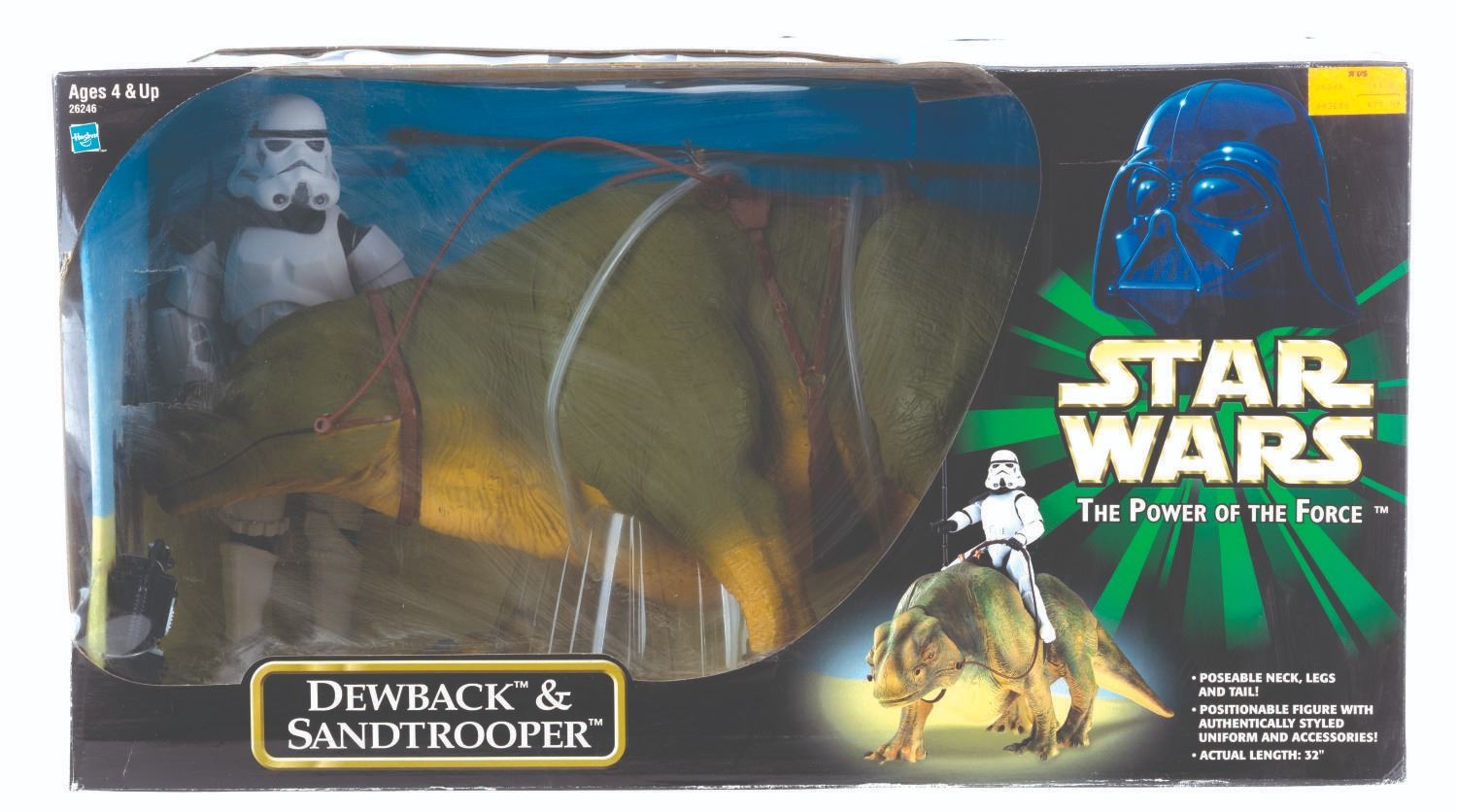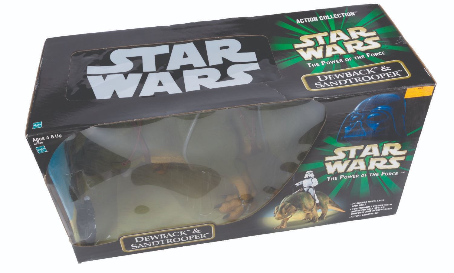 (Hasbro, 2000) A Star Wars Power of the Force 12” scale Sandtrooper and Dewback as seen in “A New Hope.” The set is in fine condition, in the unopened 24” x 13” x 9.5” good condition box.
