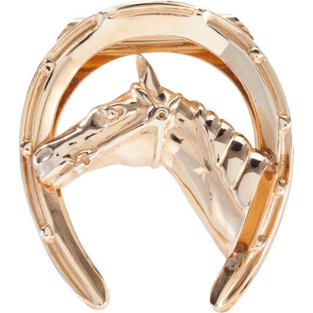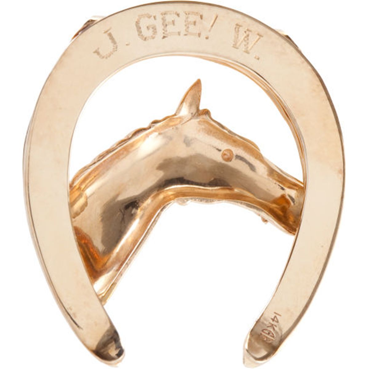 A 14K Gold Money Clip, 1950s. In the form of a horseshoe with a horse head in the center, back engraved "J. Gee! W.," with its original box.1 1/2" x 1 1/2"