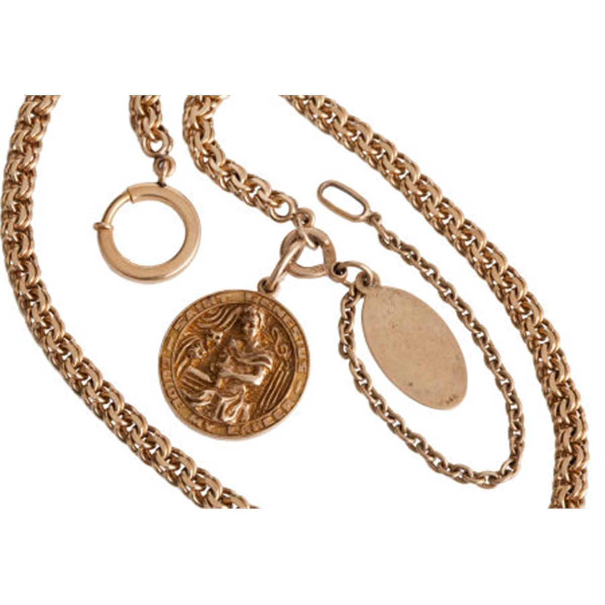 A 14K Gold Watch Fob by William Ruser, 1953. A St. Genesius [patron saint of actors] medal attached to a Milano rope chain, with an added plain oval charm attached by a smaller chain, back engraved "Happy Birthday / 1953 / Love and Kisses / Billie and Bö" [Bö Roos, Wayne's onetime business manager from the Beverly Management Corporation], further hallmarked "Copyright Ruser" [the popular Beverly Hills jeweler].Length: 20"