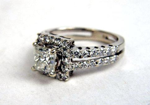 Center square-cut diamond, apx. .60pts surrounded by small round-cut diamonds, with diamond-set part-way split shank, gross weight apx. .08dwts.