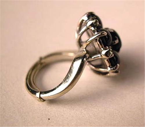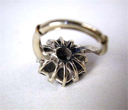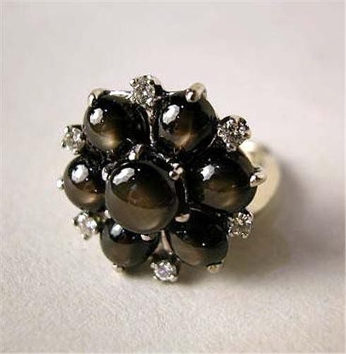 A 14K WHITE GOLD, BLACK STAR SAPPHIRE, AND DIAMOND CLUSTER RING Stamped "14K 585", with seven black star sapphires, round cabochons, total estimated weight apx. 4.25 carats, and six full cut diamonds, total estimated weight apx. 0.12 carat, clarity SI1/S12, color H-I