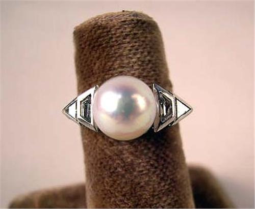 A 14K WHITE GOLD, PEARL, AND DIAMOND RING With one cultured pearl, apx. 8.62 mm, and two trapezoid cut diamonds, total estimated weight apx. 0.28 carat, clarity VS1/VS2, color H-I, and two triangular cut diamonds, total estimated weight 0.08 carat, clarity VS1/VS2, color H-I