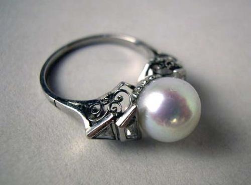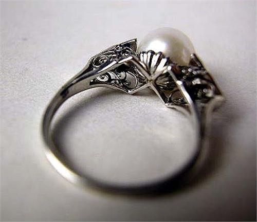 A 14K WHITE GOLD, PEARL, AND DIAMOND RING With on
