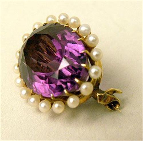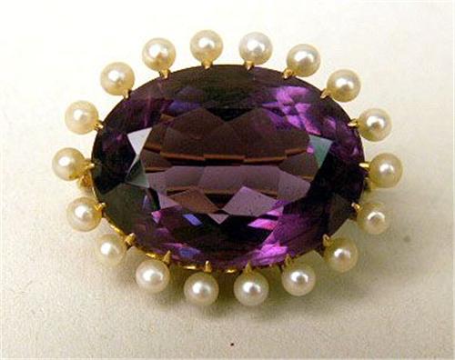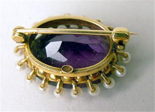 Oval faceted amethyst surrounding by eighteen small pearls. 3/4"l.