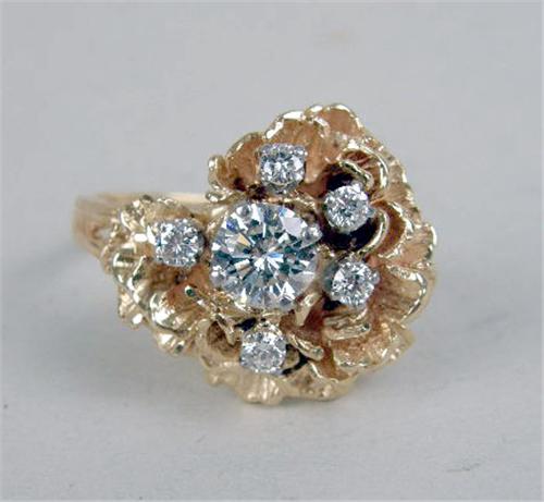 Containing a round prong-set diamond, apx. .85 cts, Color-H-I, Clarity-SI-2 surrounded by four round prong-set diamonds, each apx. .07 carats, gross weight apx. 5.6dwts.
