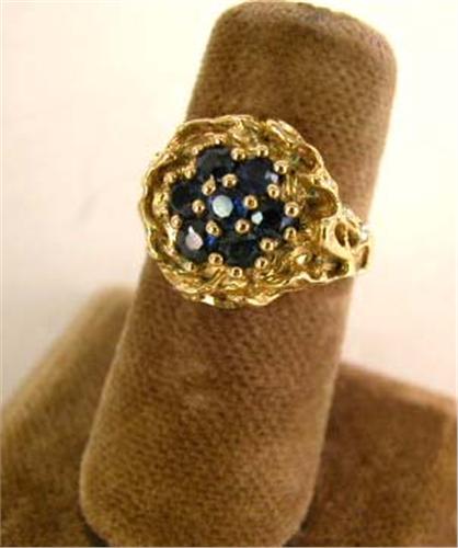 A 14K YELLOW GOLD AND SAPPHIRE FLORA-FORM RING; Center sapphire surrounded by six sapphires