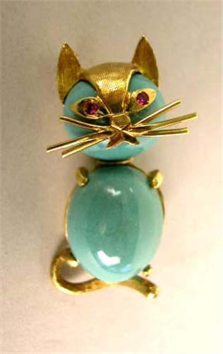 A 14K YELLOW GOLD AND TURQUOISE CAT FORM BROOCH;