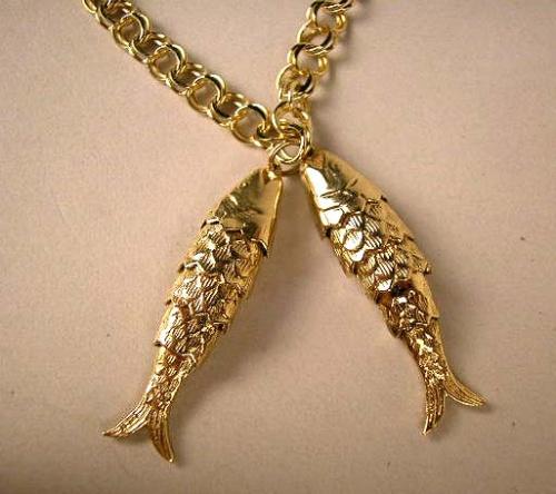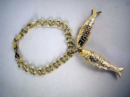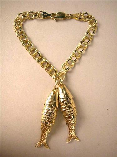 A 14K YELLOW GOLD CHARM BRACELET WITH DOUBLE HANGING FISH PENDANTS Apx. 14.5 dwt.